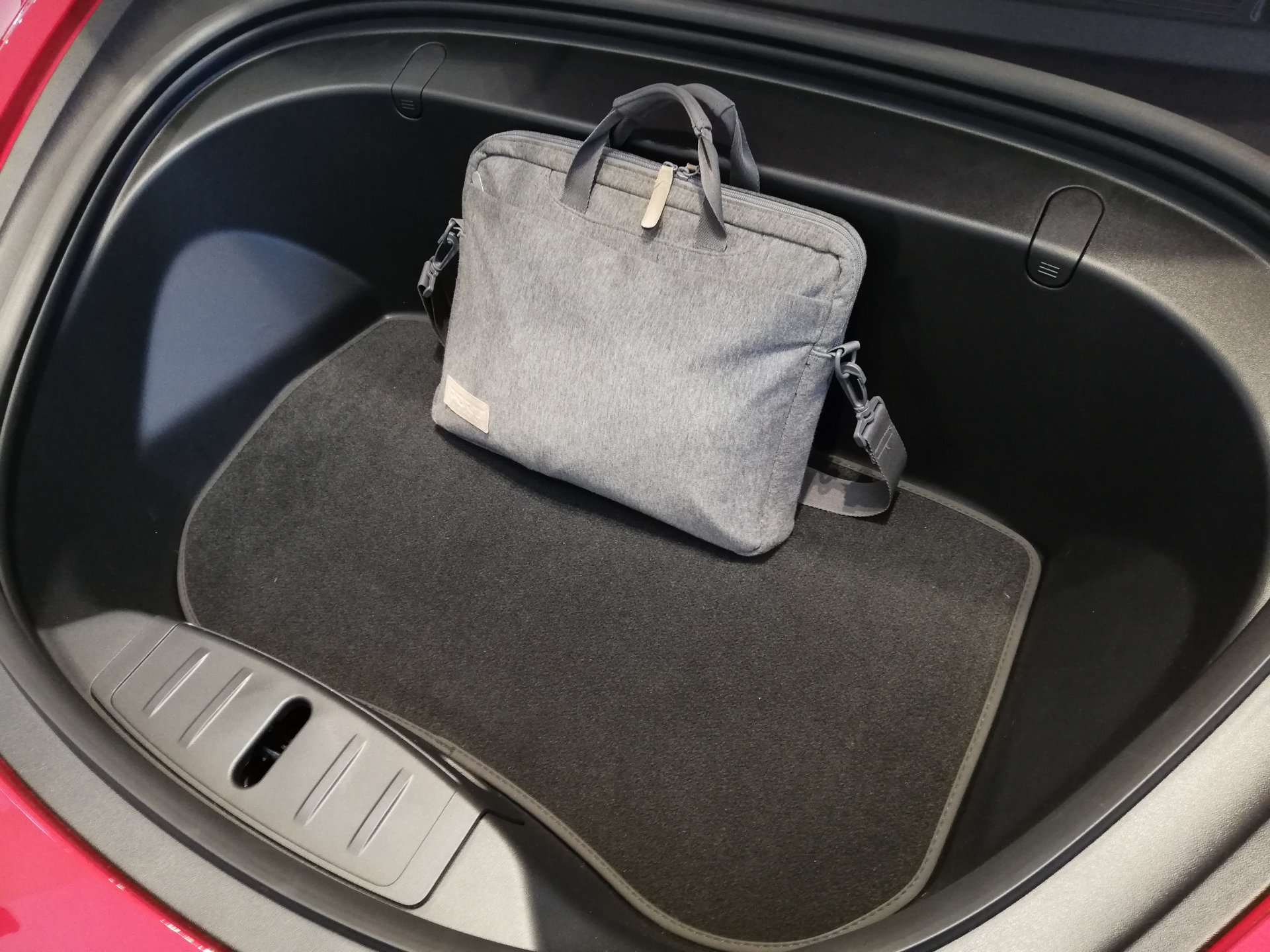 Predný kufor (tzv. „frunk“) je stále dostatočne veľký, navyše má praktickejší tvar než na Modeli S a X. Veľkosť zadného kufra je na túto triedu vozidla úplne v poriadku. Obmedzením tak bude prevažne menší nakladací otvor. Tesla v Modeli 3 ponechala aj praktické bočné úložné miesta známe z Modelu S vľavo a vpravo. Pravé z nich je rovnako ako u jeho predchodcu zaslepené subwooferom, ale iba v prípade ak je obsiahnutý v objednanom balíku.