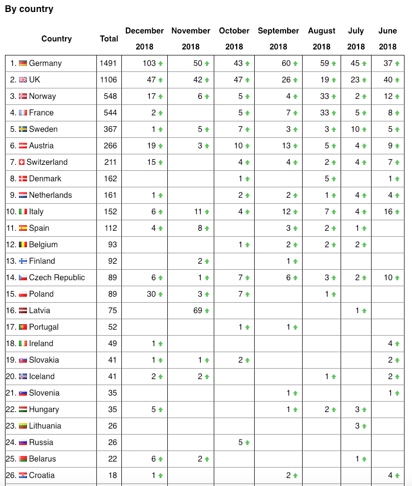 Najviac nabíjačiek s CCS konektorom môžeme nájsť v Nemecku (1491), nasleduje Veľká Británia (1106) a na treťom mieste je zatiaľ Nórsko (548). Slovensko sa samozrejme v tabuľke nachádza tiež, avšak s nepresným údajom – kým podľa zoznamu je u nás nainštalovaných iba 41 nabíjačiek s CCS konektorom, v skutočnosti je ich už minimálne 70 (36 ZSE Drive, 30 Greenway, 2 LIDL, 2 Polyfazer). V decembri 2018 pribudlo v Nemecku až 103 nabíjačiek, v Británii 47 a prekvapujúco na treťom mieste je Poľsko s 30 novými nabíjačkami.