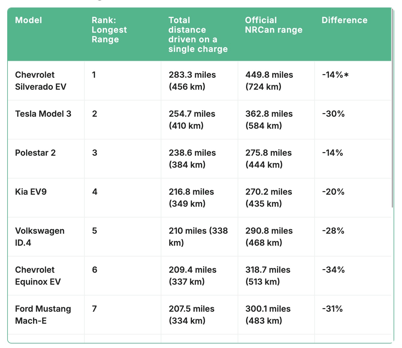 Najdlhší dojazd spomedzi testovaných vozidiel dosiahol Chevrolet Silverado, a to 456 kilometrov. Oproti udávanému dojazdu 724 km je to síce podstatne väčší rozdiel ako 14 percent, no test bol započatý s nabitím na 74 % a výsledok bol prepočítaný v súvislosti s týmto údajom. Silverado je obrovský pickup s 200 kWh akumulátorom, ktorý síce dosiahol najdlhší dojazd, no v rámci spotreby je niekde na chvoste.