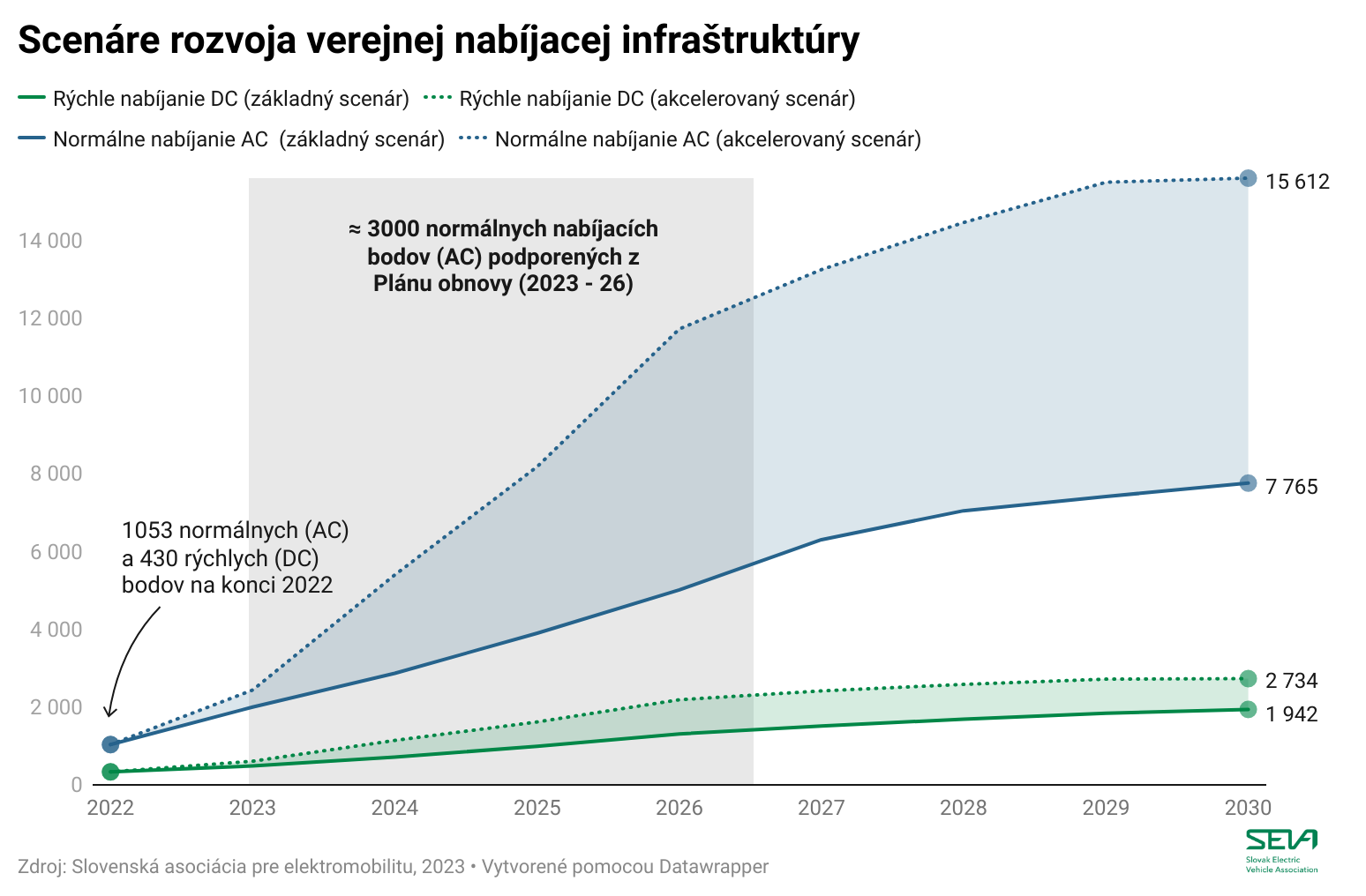 Pokiaľ by štát zaviedol podporu pre fyzické osoby aj firmy, napríklad ako v Poľsku, v akcelerovanom scenári SEVA odhaduje v roku 2025 približne 22 000 vozidiel. S podobnou logikou v dvoch scenároch by následne v roku 2030 mali elektromobily predstavovať 4,5 až 8 % slovenského vozového parku, čo je 117 000 až 213 000 vozidiel.