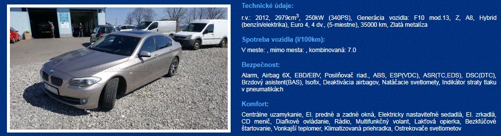V prípade, že si potrpíte na prémiové značky, športové vlastnosti a dostatok priestoru, uspokojiť by vás mohlo hybridné BMW radu 5. Je to však starší nenabíjateľný hybrid, takže nedosahuje taký stupeň elektrifikácie ako najnovšia plug-in hybridná generácia s prívlastkom iPerformance. Ponúkaný model má úplne novú batériu v hodnote 5 000 €.