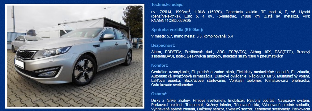 Do našej ponuky určite patrí aj krásny sedan strednej triedy Kia Optima HEV (Hybrid). Pozor, jedná sa o nenabíjateľný full hybrid, takže účasť elektromotora na pohone nie je taká významná ako v prípade najnovšieho plug-in hybridného modelu. Napriek tomu sa jedná o zaujímavé vozidlo.