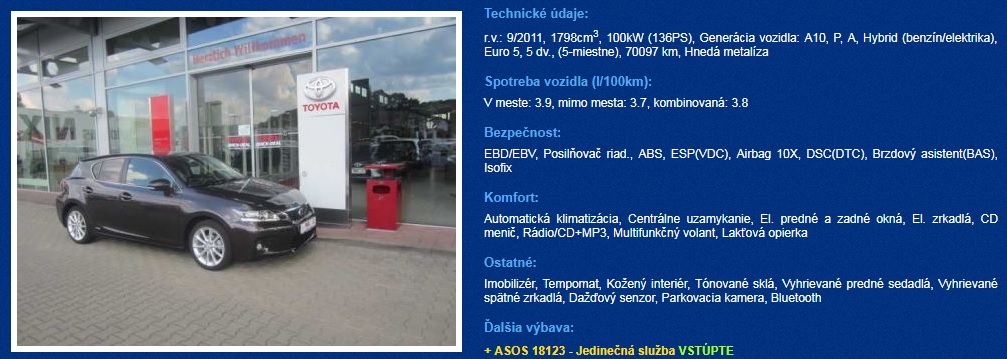 Ak chcete jazdiť ekologickejšie a ekonomickejšie a zároveň chcete byť originálny, doprajte si Lexus CT 200h. Luxusnejšia odroda Toyoty vám okrem originality prinesie aj spoľahlivú hybridnú jednotku.
