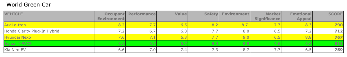 Okrem toho Jaguar I-Pace vyhral aj cenu zeleného automobilu, takže takého, ktorý je najšetrnejší k životnému prostrediu. V tejto kategórii sme mali možnosť vidieť aj ďalšie zaujímavé modely, ktoré nejazdia na konvenčný pohon. I-Pace za sebou nechal znovu Audi e-tron, ktorý sa musí uspokojiť s druhým miestom, tretí je Hyundai Nexo.