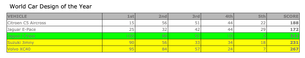 A aby toho nebolo málo, tak Jaguar I-PACE získal ešte jednu cenu. Konkrétne cenu za najlepší dizajn roka. V tejto kategórii za sebou nechal Volvo XC40 na druhom mieste a Suzuki Jimny na treťom.