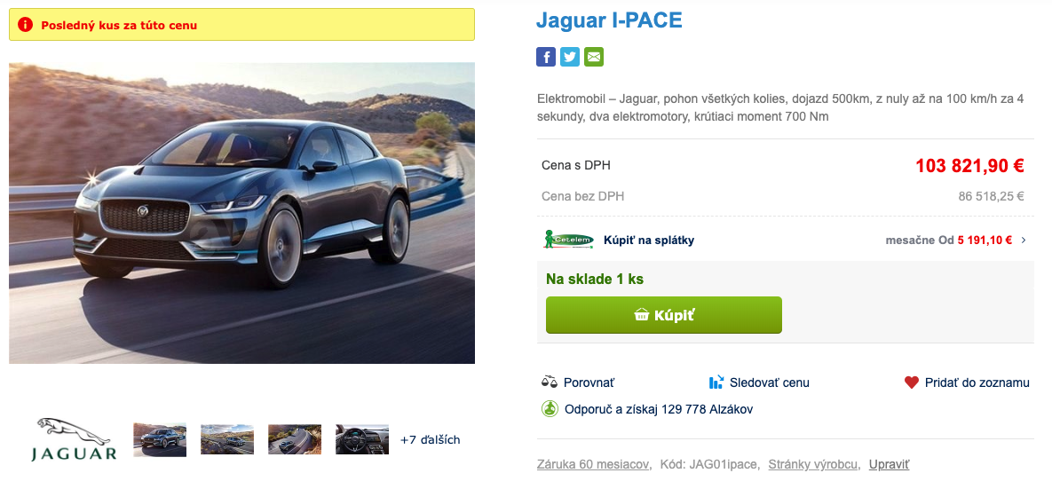 Najväčší český e-shop, ktorý má silné zastúpenie aj na Slovensku, opäť rozširuje ponuku elektromobilov. Už dlhšie majú zákazníci možnosť kúpiť elektromobily Tesla či BMW i3, teraz sa k nim pridáva prémiová novinka – Jaguar I-PACE. Zákazníci si ho budú môcť kúpiť doslova pomocou pár kliknutí (ako je pri Alze štandardom) a spočiatku bude k dispozícii 5 kusov.