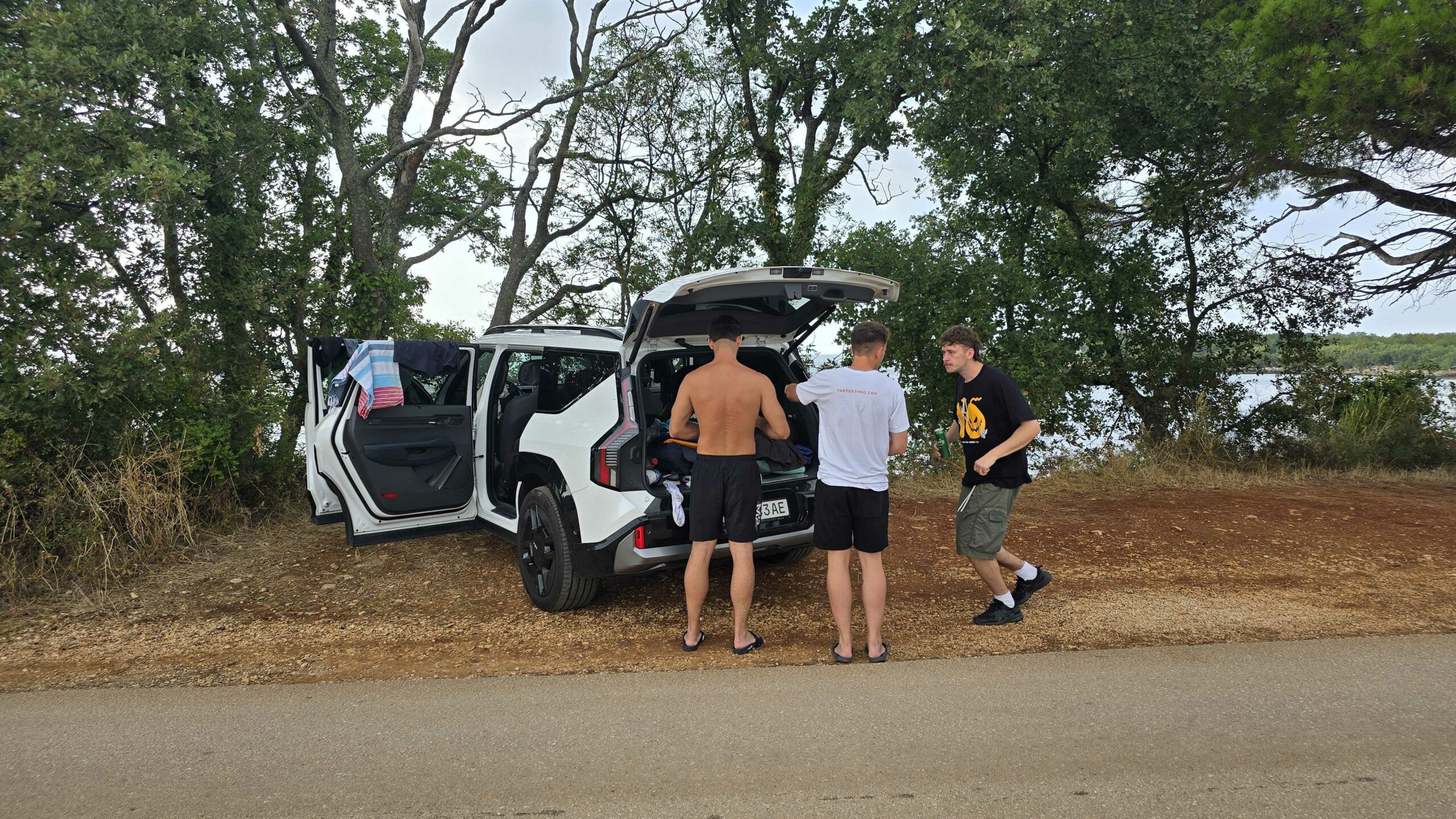 Veci z kufra sme uložili do medzier medzi sedadlami (mali sme 6-miestnu verziu), a tiež za predné sedačky a prekvapivo sa pomestili bez väčších problémov. Ako sa nám prvú noc spalo? No nič extra. V noci bolo hrozné teplo, tak sme museli mierne stiahnuť okná, no do toho začalo aj pršať, čiže sme ich museli naspäť vytiahnuť. Ak sa pýtate, prečo sme nepoužívali klimatizáciu, tak najmä kvôli tomu, že nám neostávalo veľa % batérie a nechceli sme riskovať, že by sme nemuseli dôjsť na nabíjaciu stanicu v prípade použitia klímy.