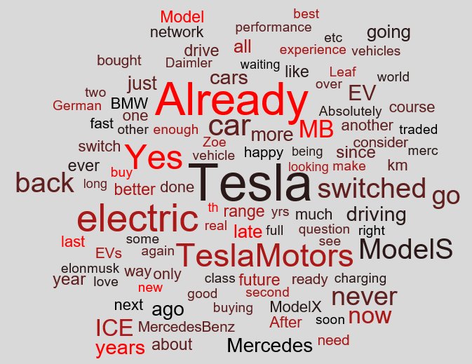 Spoločnosť Mercedes-Benz Retail Group položila svoju otázku jednoduchou formou tweetu na sociálnej sieti Twitter. Dočkala sa pritom viac ako 500 odpovedí. Tie boli pritom veľmi pozitívne. Mapu najčastejšie sa vyskytujúcich kľúčových slov v odpovediach si môžete pozrieť na nasledujúcom obrázku.