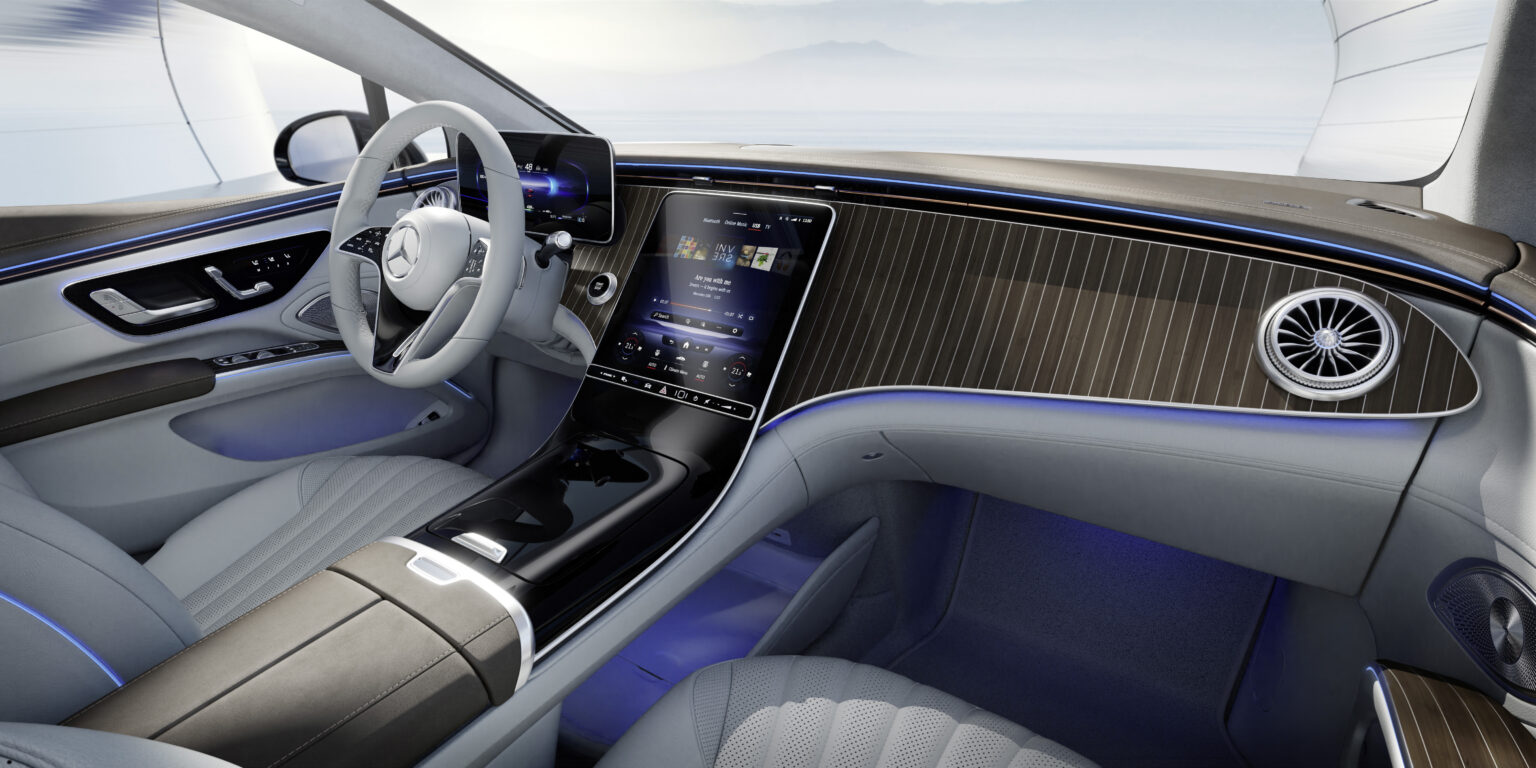 Interiér Mercedesu EQS je prelomový a nie je vôbec ďaleko od konceptu tohto vozidla. Sú tu spojené technologické vychytávky, futuristické prvky a zároveň tradičné luxusné materiály v čistých líniách. Obrazovka Hyperscreen je zložená z troch samostatných dotykových displejov.