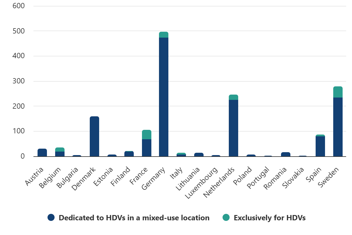 Z celkového počtu 1 512 nabíjacích staníc je 1 369 určených na zmiešané využitie, teda sú vhodné pre nákladné aj ľahké úžitkové vozidlá. Zvyšných 143 staníc je určených výhradne pre ťažké nákladné vozidlá. Tento stav ukazuje, že hoci väčšina infraštruktúry je zameraná na zdieľanie medzi rôznymi typmi vozidiel, špecializované stanice pre nákladné vozidlá postupne pribúdajú, najmä na hlavných európskych dopravných trasách.