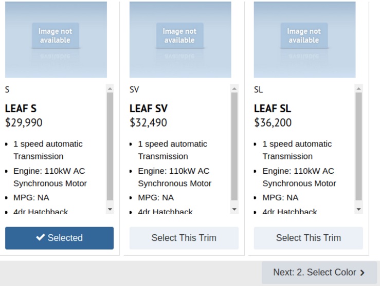 Na americkom trhu budú k dispozícii 3 výbavové verzie, a to S, SV a SL. Ich ceny majú byť 29 990 USD, 32 490 USD a 36 200 USD. Tieto ceny platia pre modely so 40 kWh batériou a 110 kW výkonom. Budúci rok by mala pribudnúť verzia s 50 až 60 kWh batériou.