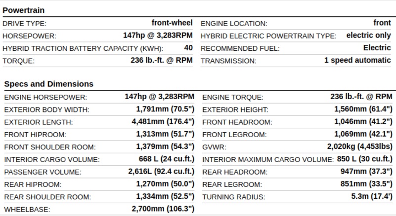 Výkon pohonnej jednotky je 110 kW (147 k), čo je takmer o 30 kW viac ako v prípade pôvodného modelu. Krútiaci moment má hodnotu 320 Nm. Elektromotor je synchrónny a na striedavý prúd, čo nie je samozrejme žiadaným prekvapením. Je umiestený vpredu, logický teda poháňa prednú nápravu. Batéria má kapacitu 40 kWh, údaj o dojazde nie je známy.