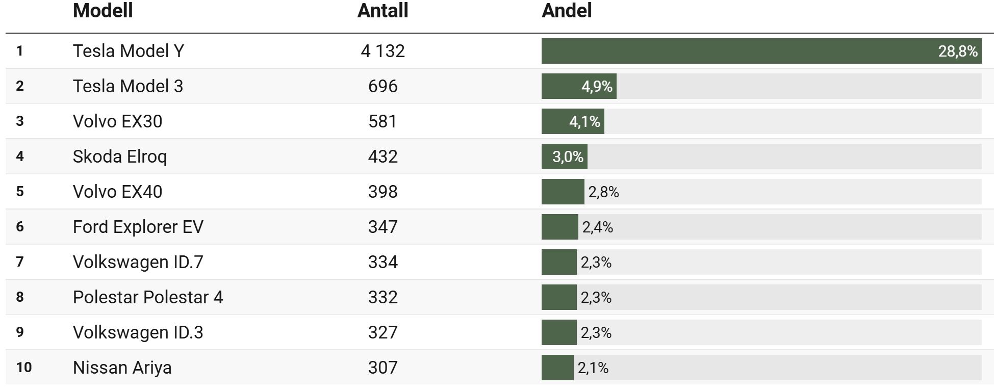 Kráľom predajov je stále Tesla, aj keď celosvetovo nedosahuje také čísla, aké očakávala. V Nórsku má trhový podiel medzi elektromobilmi veľmi slušných 34 percent. Nikoho snáď neprekvapí, že najúspešnejším elektromobilom je Model Y, ktorý zaznamenal 28,8-percentný podiel na trhu. Okrem Tesly sa darí aj Volkswagenu, Volvu, Toyote či BMW.