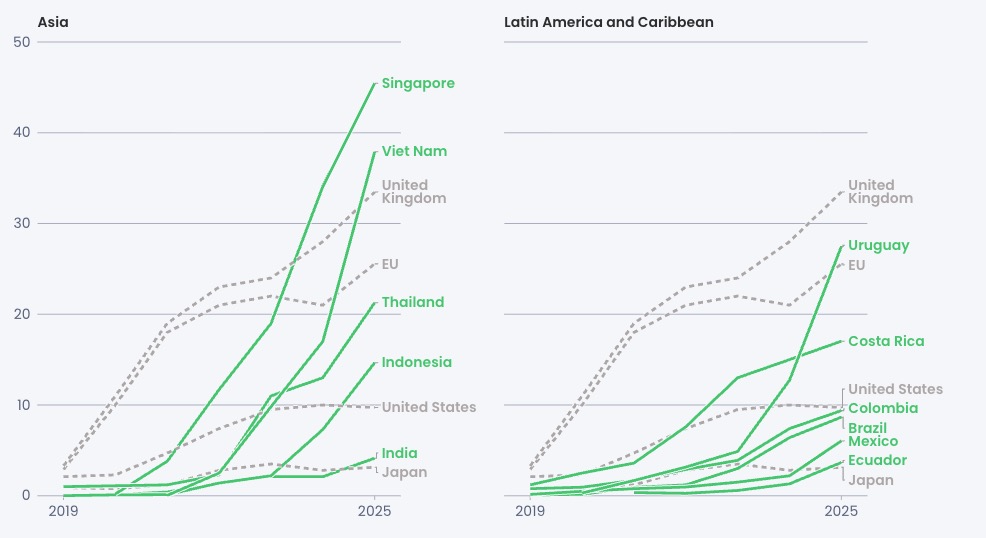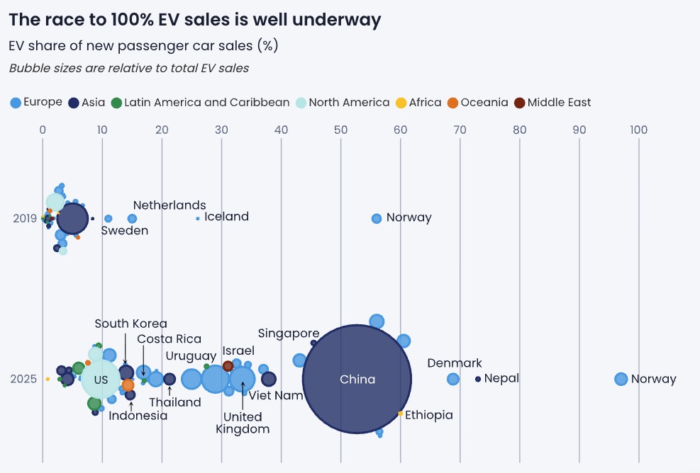 V súčasnosti je na svete 39 krajín, kde elektromobily tvoria viac ako 10 percent predaja nových áut. V roku 2019 to boli len štyri krajiny. Keď prišiel rok 2025, v tom sa významnou silou v globálnom prijatí elektromobilov stali krajiny juhovýchodnej Ázie. Napríklad Singapur a Vietnam dosiahli podiel predaja elektromobilov na úrovni okolo 40 percent, čím dokonca prekonali Spojené kráľovstvo či Európsku úniu ako celok.