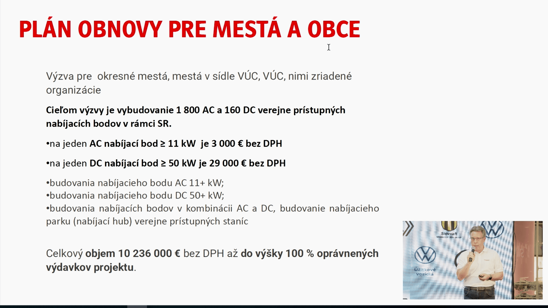 - V blízkej budúcnosti môže byť pomocou Plán obnovy pre mestá a obce, ktorý podporuje budovanie ďalších verejne prístupných nabíjacích staníc (1800 AC, 160 DC). Tento dotačný program už aktuálne prebieha a využiť ho môžu okresné mestá, mestá, VÚC a nimi zriadené organizácie.