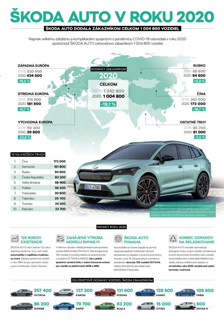 Najväčšie trhy pre Škoda Auto sa výraznejšie nemenili. Čína zostáva na čele s počtom 173 tisíc dodaných áut. Tesne na druhom mieste je Nemecko s počtom 161 800 áut, pričom prvú trojku uzatvára 94 600 vozidiel. Domáca Česká republika sa teda umiestnila na štvrtom mieste s počtom 83 200 dodaných automobilov. Za jeden z míľnikov roka 2020 považujú zahájenie výrobu prvého čisto elektrického SUV Škoda Enyaq iV.
