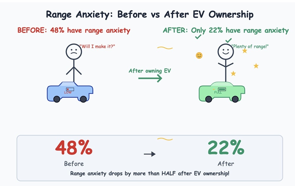 Startup Recurrent, ktorý sa venuje sledovaniu stavu batérií v elektromobiloch, publikoval na konci roka analýzu založenú na viacerých grafoch. Jeden z dátových súborov ukazuje, ako takzvaná „úzkosť z dojazdu“ klesá, čím dlhšie človek elektromobil vlastní. Podľa dát od Plug In America malo pred kúpou elektromobilu 48 % ľudí obavy z dojazdu, po kúpe a krátkom používaní ich však zostalo len 22 %.