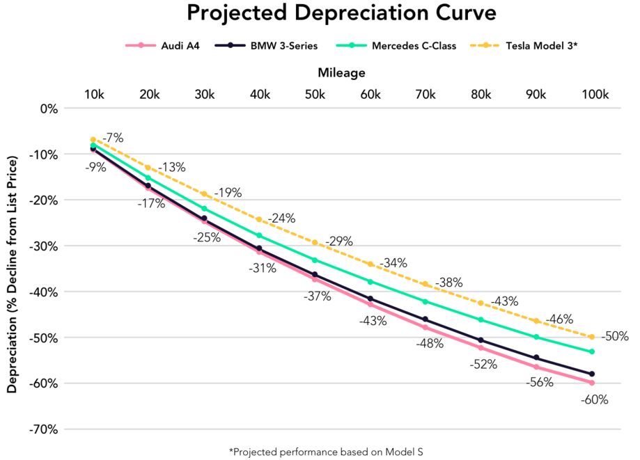 „Odvodzujúc od vývoja amortizácie Modelu S a cien konkurenčných modelov prognózujeme, že Tesla Model 3 bude mať najnižšiu mieru amortizácie vo svojej triede. Po 80 000 km by mala stratiť iba 29 % zo svojej hodnoty a po 160 000 km 50 % hodnoty.“