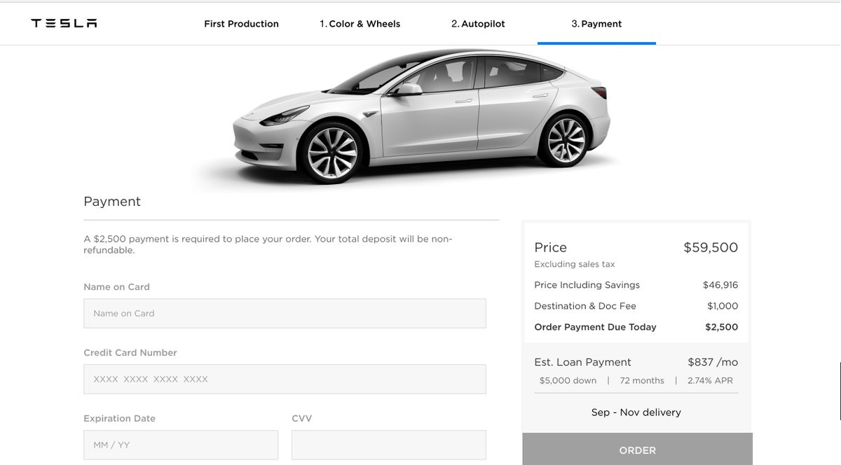V rámci piatkového oficiálneho predstavenia výrobnej verzie Tesly Model 3 boli odovzdané prvé vozidlá 30 šťastným majiteľom. Deň na to prišli pozvánky ďalším z prvých držiteľov rezervácií, a to do online konfigurátora „Design Studio“. Možnosti konfigurácie sú však obmedzené.