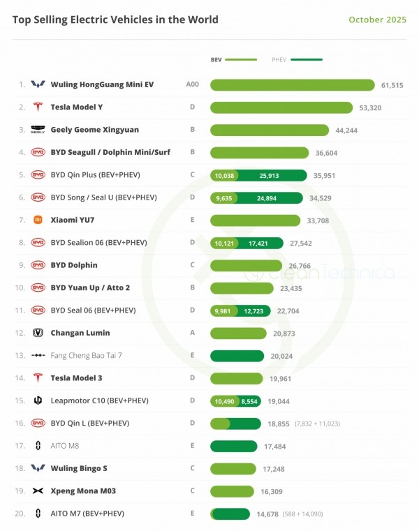 Wuling Mini EV zaznamenal rekordných 61 515 predaných kusov za jediný mesiac. Naopak, Model Y od Tesly klesol o 37 % na 53 320 kusov v októbri. Ešte výraznejší prepad zaznamenal Model 3, ktorý skončil „až“ na 14. mieste a zažil svoj najhorší predajný mesiac za posledné tri roky. Tento vývoj súvisí najmä s poklesom záujmu na americkom trhu, kde registrácie klesli o polovicu. Spomalenie sa prejavilo aj v Číne, hoci Európa a ďalšie regióny vykázali silný rast.