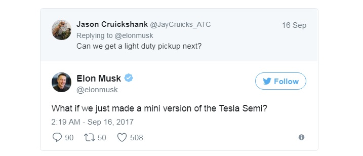 Aktuálne reagoval na dotaz fanúšika ohľadom dostupnosti elektrického pickupu slovami: „Čo ak sme urobili mini verziu Tesla Semi?“. Čo si však máme pod tým predstaviť? Odpoveď by mohla naznačovať, že Tesla Pickup by mohol zdieľať spoločnú techniku s ťahačom Tesla Semi. V rámci odhalenia elektrického ťahača sa Elon Musk taktiež vyjadril, že toto predstavenie nebude možno len o Tesle Semi. Že by sme sa tak dočkali aj odhalenia (aspoň) dizajnovej koncepcie pickupu?
