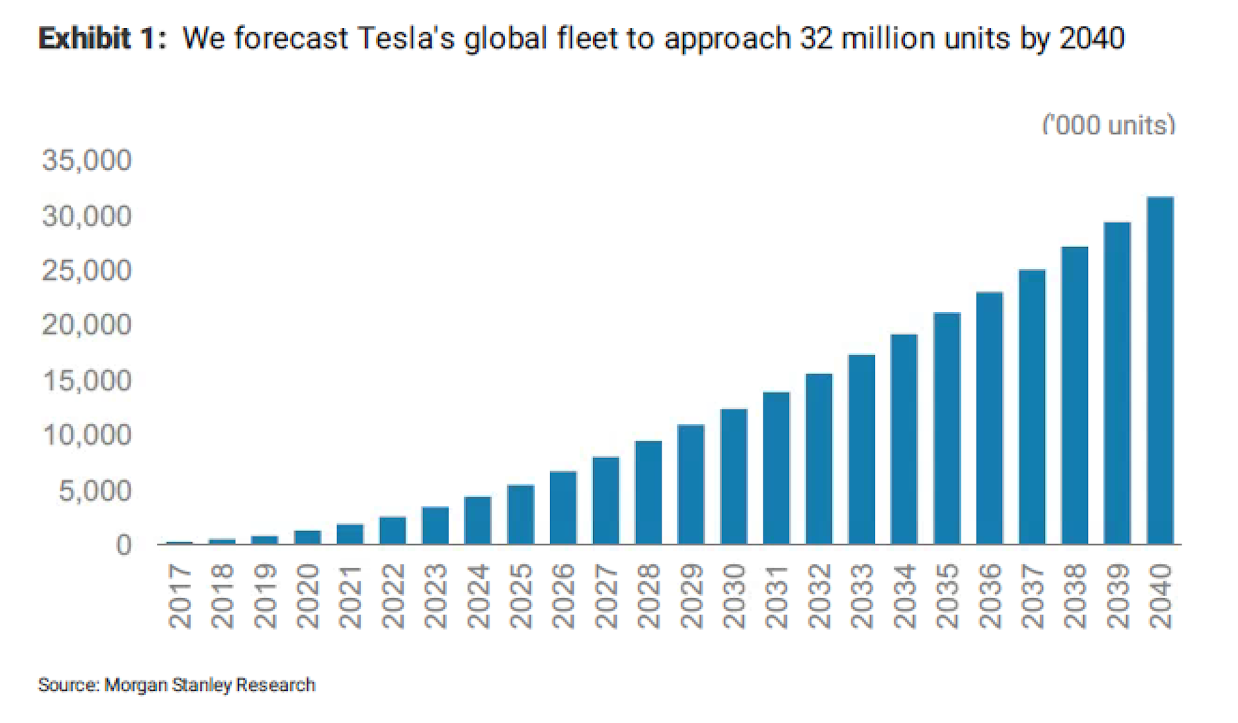 Analytik významnej investičnej banky Morgan Stanley, Adam Jonas, ktorý sa špecializuje na automobilová trh, predpovedá Tesle skvelú budúcnosť. O 10 rokov má mať na cestách 10 miliónov elektromobilov. A v roku 2040 to má byť dokonca 32 miliónov.