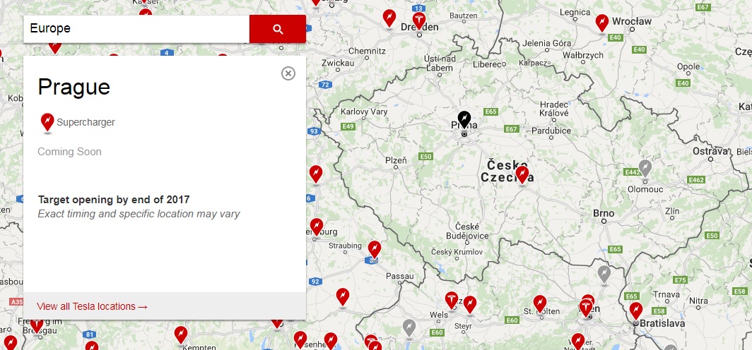 Podľa oficiálnej mapy pre Superchargery má Tesla v pláne sprevádzkovať tento rok v Česku dve nabíjacie stanice. Jedna z nich sa má nachádzať v Olomouci a druhá v Prahe. Všetko však nasvedčuje tomu, že to nebude priamo v hlavnom meste, ale v jeho blízkosti. Konkrétne v obci Vestec, ktorá sa nachádza cca 16 km od Prahy.