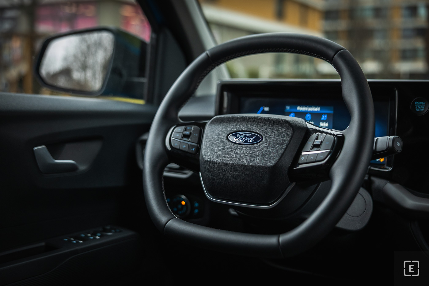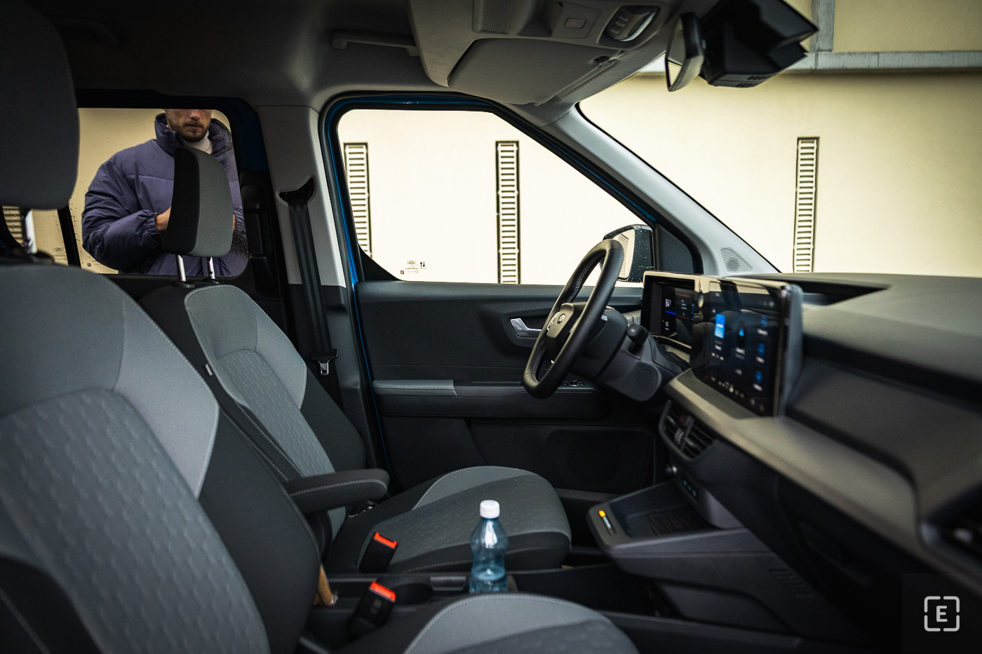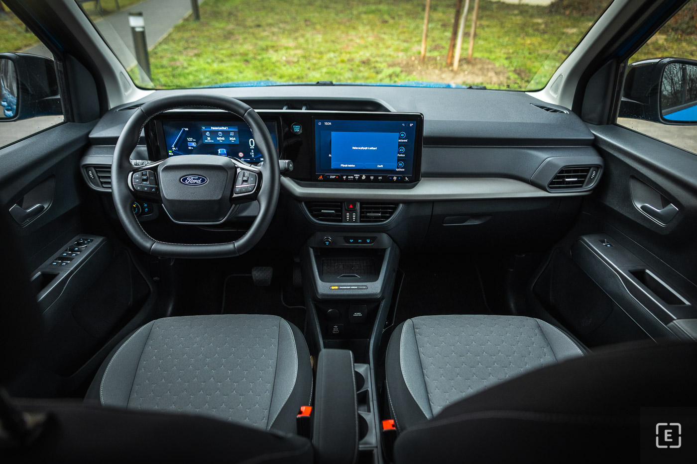 Po nastúpení vás privíta vzdušný a priestranný interiér. Vďaka vysokej streche majú cestujúci (a to aj autor s výškou 190 cm) nad hlavou doslova „kubíky“ vzduchu, čo Ford využil na praktickú odkladaciu policu nad predným oknom. Druhou stranou mince je, že tento vzduch v zime treba aj vykúriť, čo sa podpíše na spotrebe aj dojazde.