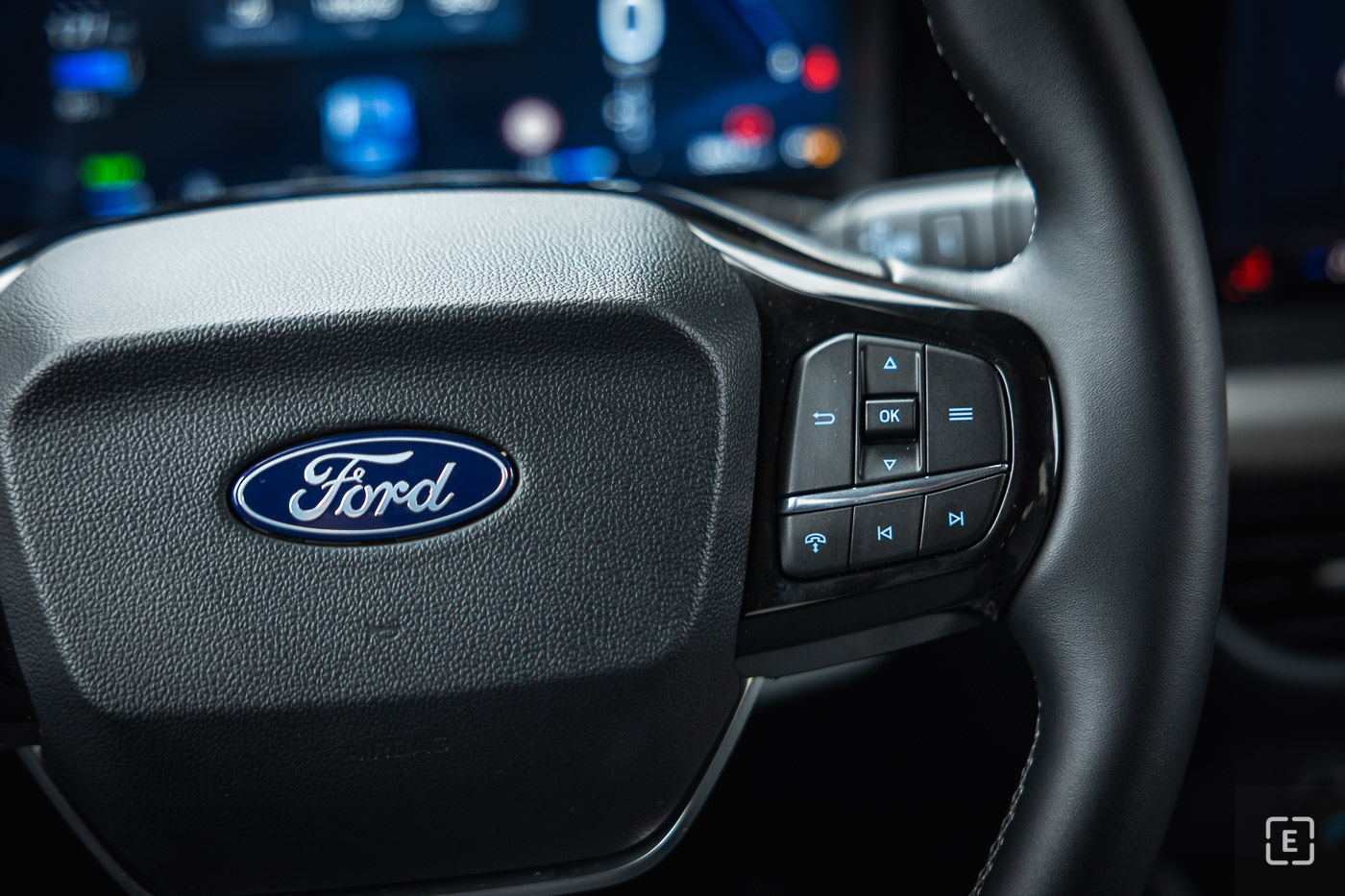 Podvozok je nastavený typicky „fordovsky“ – je tuhší, čo zabezpečuje dobrú kontrolu nad karosériou v zákrutách a menej náklonov, než by ste pri tak vysokom aute čakali. Pomáha mu aj nízke ťažisko vďaka akumulátoru v podlahe, naopak cítiť odľahčenú prednú časť, kde absentuje hmotnosť spaľovacieho motora.