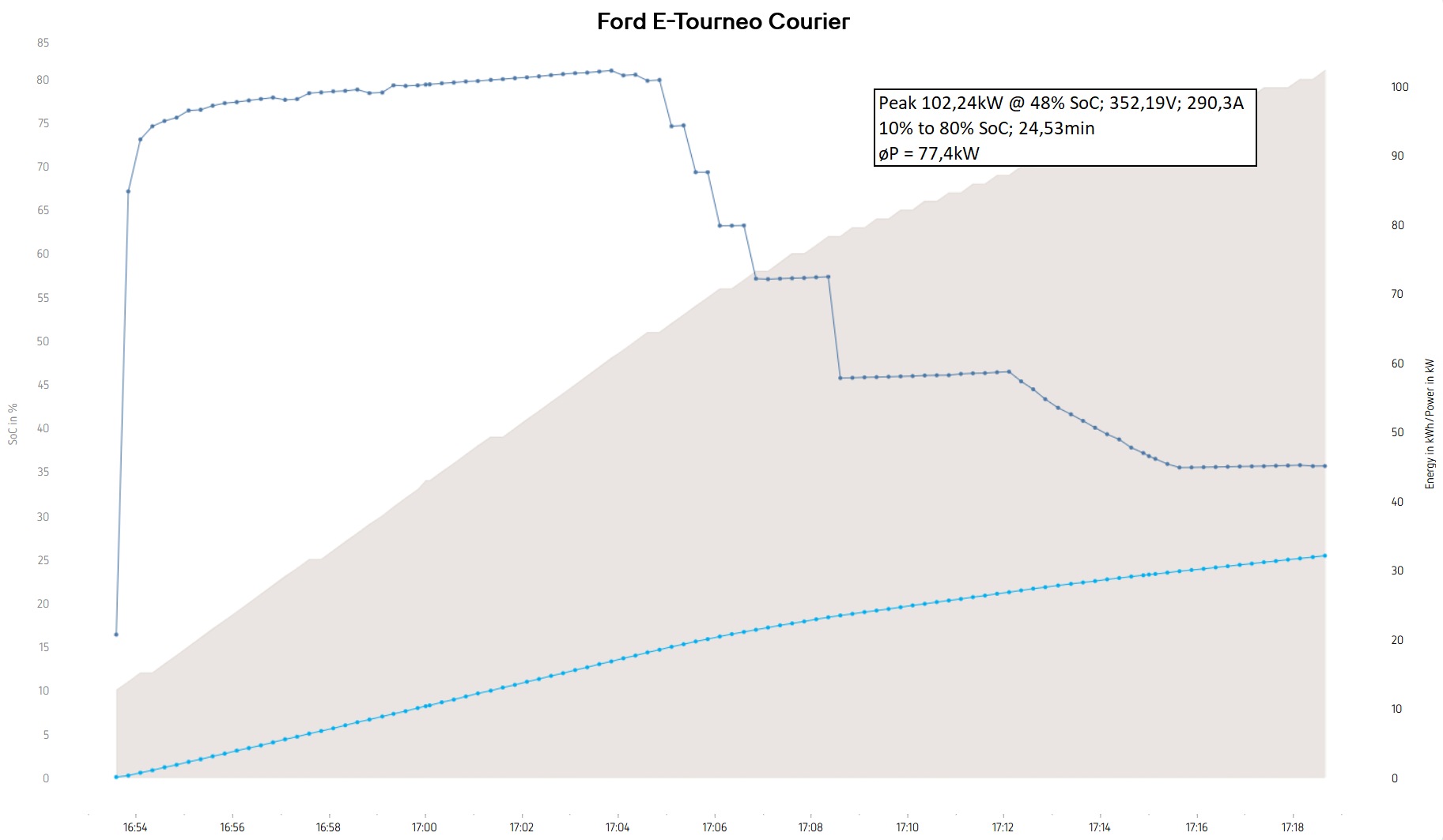 Referenčné nabíjanie z 10 na 80 % SoC nám s Ford E-Tourneo Courier trvalo 24,5 minúty. To je napriek chladnému počasiu len o 1,5 minúty dlhšie oproti údajom od výrobcu. Priemerný nabíjací výkon medzi 10-80 % nabitia dosiahol 77,4 kW.