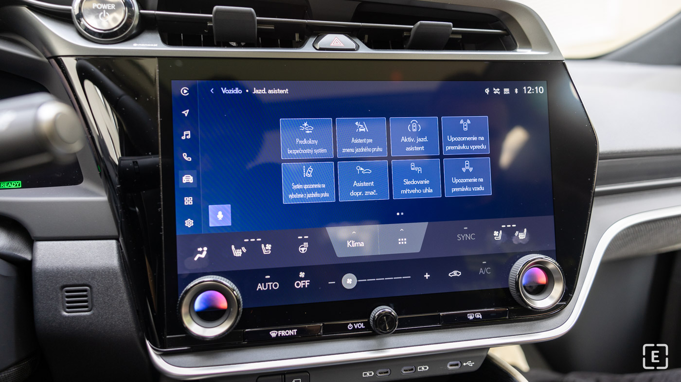 Infotainment vozidla pozostáva z troch displejov, a to hlavný displej infotainmentu, displej vodiča a head-up displej. Začneme s tým hlavným displejom. Ten je pekne spracovaný s tým, že na na ňom nachádzajú aj dve fyzické koliečka na nastavovanie teploty. Pod displejom sa potom nachádzajú ešte dve tlačidlá na ovládanie klimatizácie (pričom ostatné nastavenia klimatizácie sú hneď nad tým priamo na displeji) a jedno koliesko na ovládanie hlasitosti systému. Ešte nižšie nájdeme aj 3x USB-C vstupy na kábel a tlačidlá na ovládanie kamery vozidla.