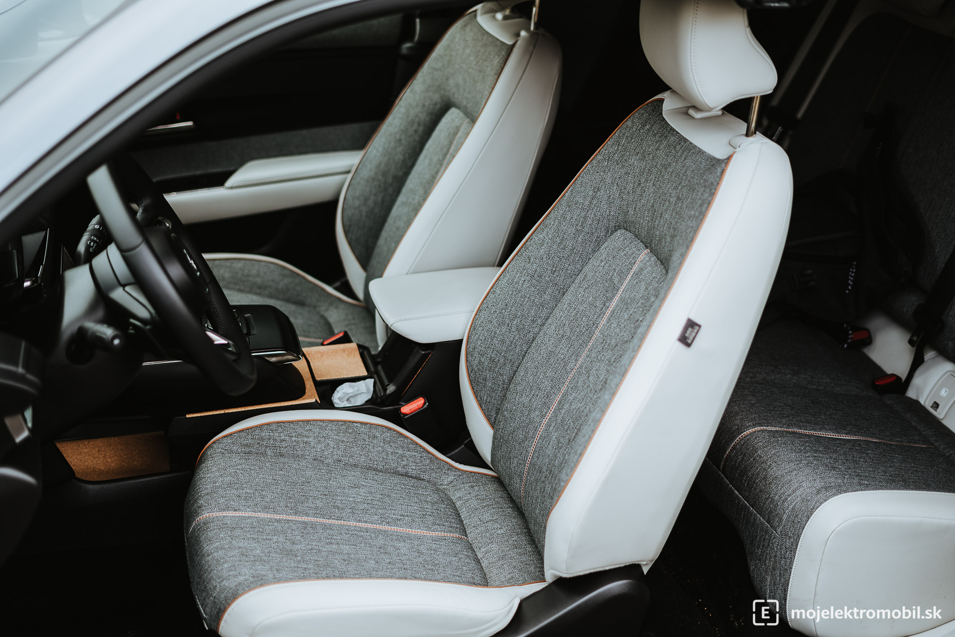 Interiér pôsobí dobre. Výrobca stavil na korok, ktorým odkazuje na svoje začiatky. Ovládací panel síce má plasty, ktoré pôsobia lacnejšie, no zásadne to nevadí. Hneď pri ňom sa nachádza displej určený na ovládanie klimatizácie. Infotainment zastupuje menší displej, ktorý je od vodiča vzdialený a teda ani nie je dotykový. Bolo by to zbytočné. Ovládanie teda musíte riešiť cez spomínaný ovládací panel. Nevadí to, systém je na to prispôsobený, pocítite to však po pripojení Android Auto, ktorý je skôr optimalizovaný na dotyk, no aj tu sa to dá akceptovať.