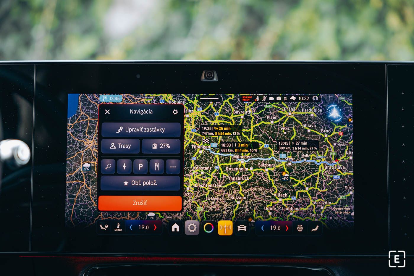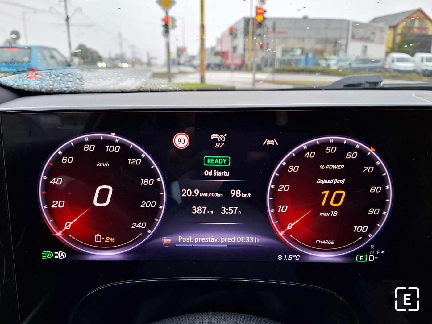 Z Bratislavy sme vyrazili s vozidlom nabitým na 98 percent. Vonkajšia teplota sa pohybovala okolo 1-2 stupňov Celzia, celou cestou padal jemný, no hustý dážď. Od Novej Bane sa z neho stal dážď so snehom, o niečo sa ochladilo a okolitá krajina bola zasnežená. Oboje má na spotrebu zásadný negatívny vplyv, navyše si svoju daň vyberie aj kúrenie.