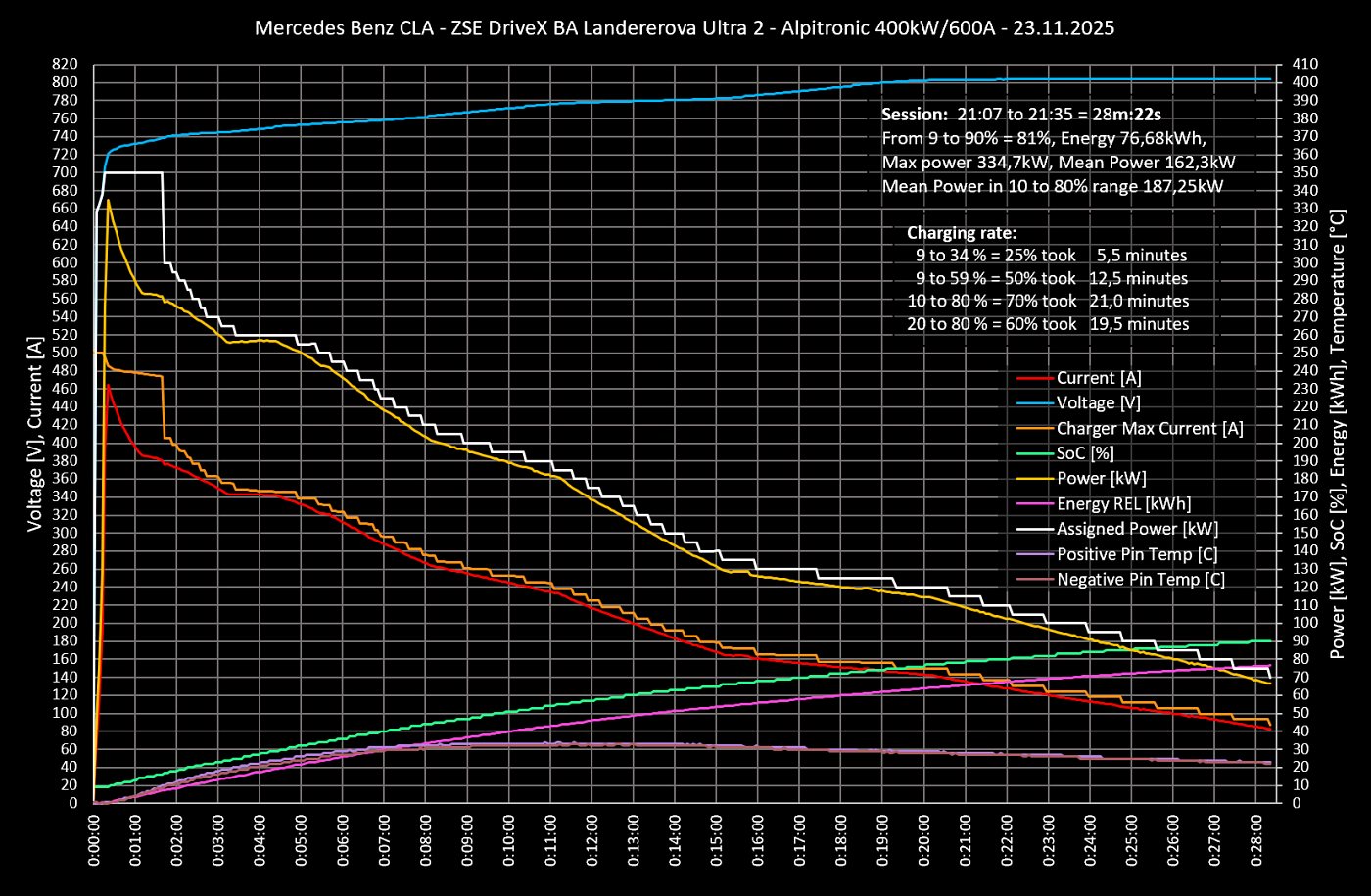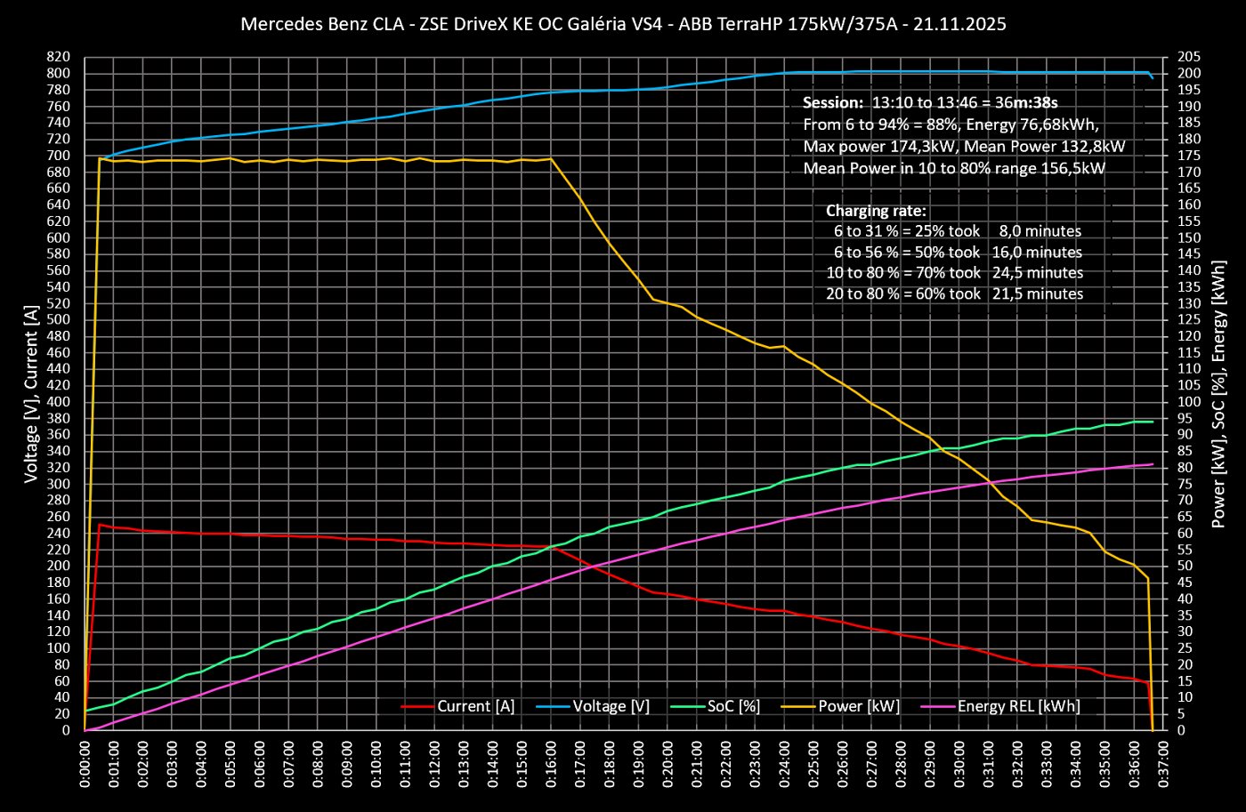 Keďže nie vždy a všade narazíte na takto výkonnú nabíjačku, rozhodli sme sa otestovať nabíjanie aj na bežnejšej 175 kW / 375 A nabíjacej stanici. Na tejto sa nabilo z 10 na 80 % SoC za stále slušných 24,5 minút; teda hodnota značne lepšia oproti 400 V elektromobilom s podobnou kapacitou akumulátora.