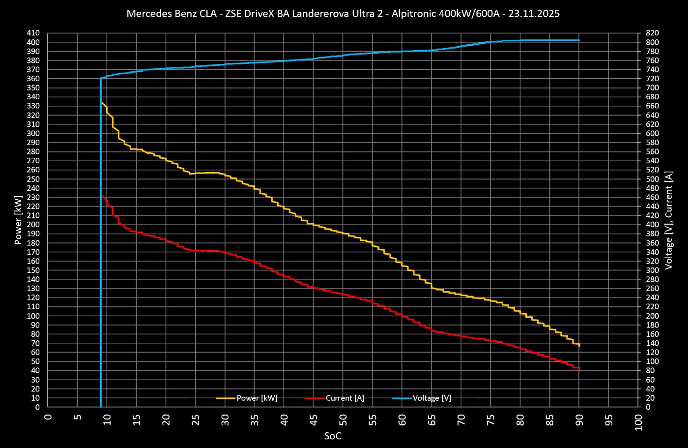 Nabíjanie sme samozrejme vyskúšali aj my, a to rovno na najvýkonnejšej 400 kW / 600 A nabíjacej stanici od ZSE Drive na Landererovej ulici. Tam sme absolvovali nabíjanie s predohriatym akumulátorom v takmer celom bežne používanom pásme 9-90 % SoC. Pohľad na nabíjaciu krivku prezradí, že výrobcom udávaný maximálny DC nabíjací výkon (320 kW) sa nám podarilo značne prekročiť – dosiahli sme až 334,7 kW. Ide o najvyšší výkon, aký sa nám zatiaľ podarilo dosiahnuť spomedzi všetkých testovaných vozidiel.