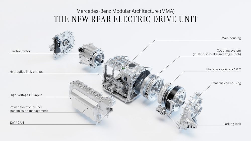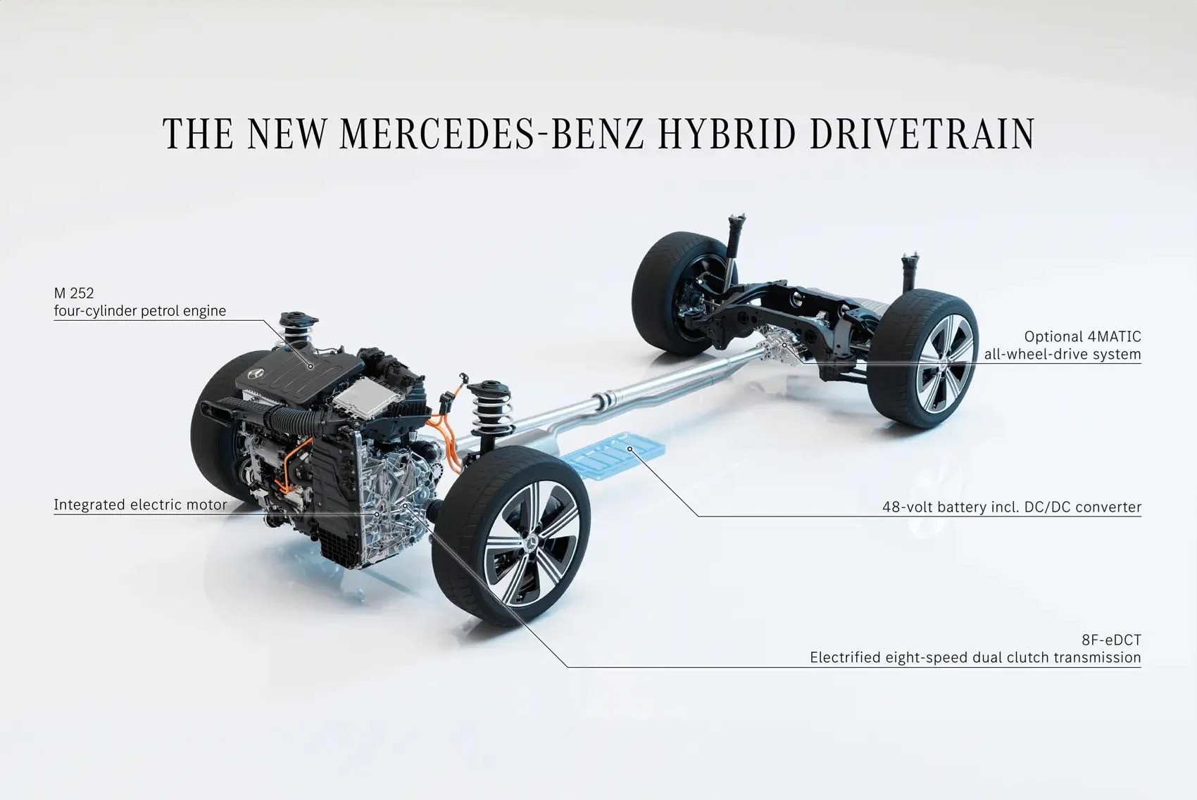 Zaujímavosťou je, že v prípade spaľovacej verzie motor uložený vpredu poháňa kolesá prednej nápravy, pre verzie 200 a 220 je k dispozícii aj pohon všetkých kolies 4MATIC. Na druhú stranu, elektrické varianty s motorom uloženým vzadu sú prioritne s pohonom zadných kolies, vrcholný variant 350 4MATIC k nemu pridáva aj sekundárny predný elektromotor pre pohon prednej nápravy.