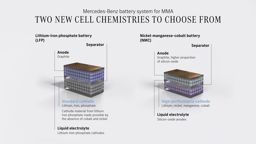 Nedávno uvedený základný variant Mercedes-Benz CLA 200 with EQ Technology ponúkne batériu s chemickým zložením z lítia, fosfátu a železa (LFP / LiFePo) s využiteľnou kapacitou 58 kWh. Vďaka maximálnemu DC nabíjaciemu výkonu 200 kW a priaznivej nabíjacej krivke trvá nabíjanie z 10-80 % len 20 minút.
