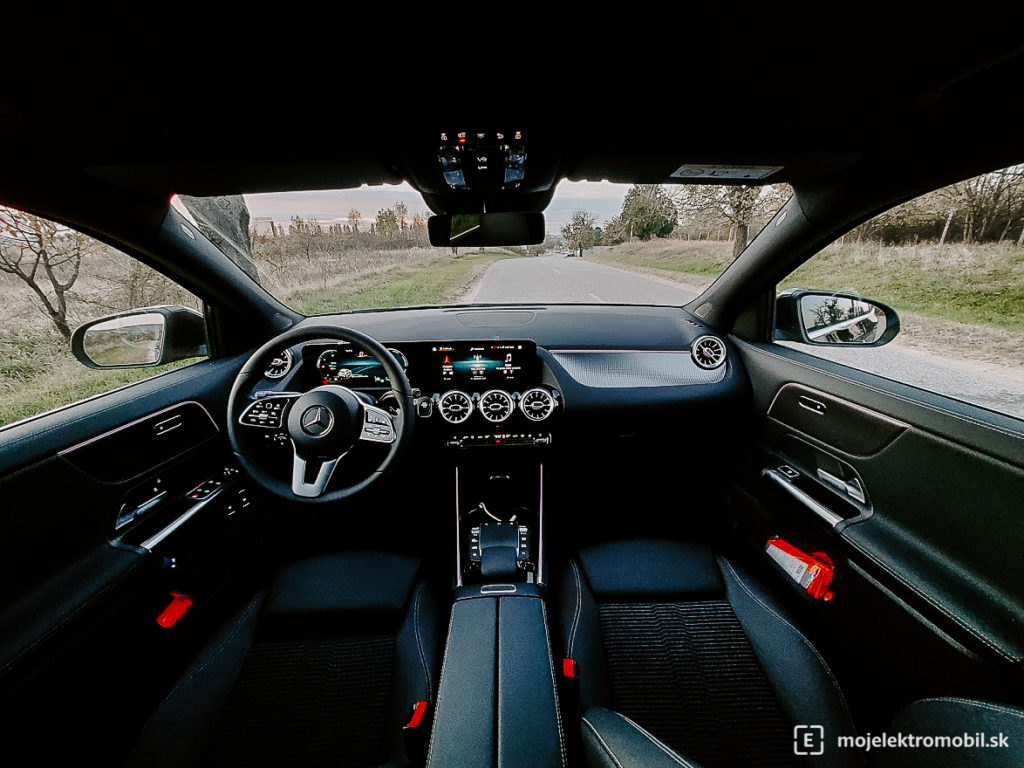 Na dverách bola kombinovaná prešívaná koža s plastovými, ale aj kovovými prvkami pri rúčke otvárania a zatvárania dverí a podobne. Príjemne pôsobia aj lesklé plasty, aj keď je pravda, že pre niekoho môžu byť zbytočne rušivé. Predstava, že časom pochytajú škrabance tiež nie je príjemná. Displej infotainmentu a volant je aktuálna klasika. Infotainment sa skladá z dvojice displejov s vysokým rozlíšením. Vďaka tomu je zobrazenie skutočne jemné a aj zblízka je takmer nemožné vidieť jednotlivé pixely. Ovládací panel je opäť klasický s dotykovou plochou pre pohodlné ovládanie všetkých funkcií. Mercedes má dobre zvládnutú navigáciu, ktorá zobrazuje dostupné nabíjacie stanice, a to spolu s obsadenosťou jednotlivých konektorov.