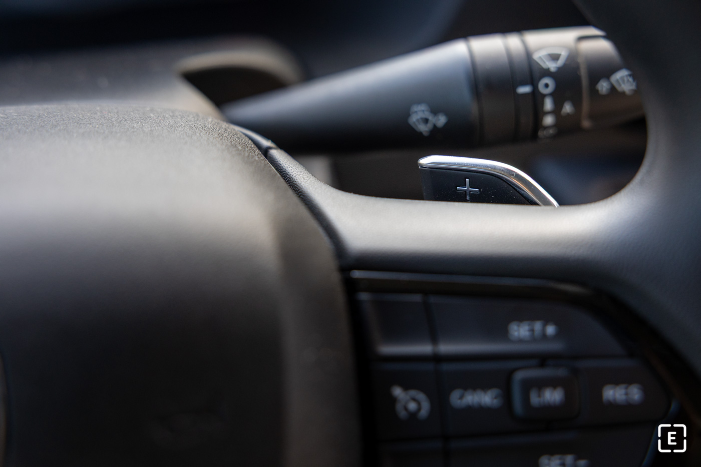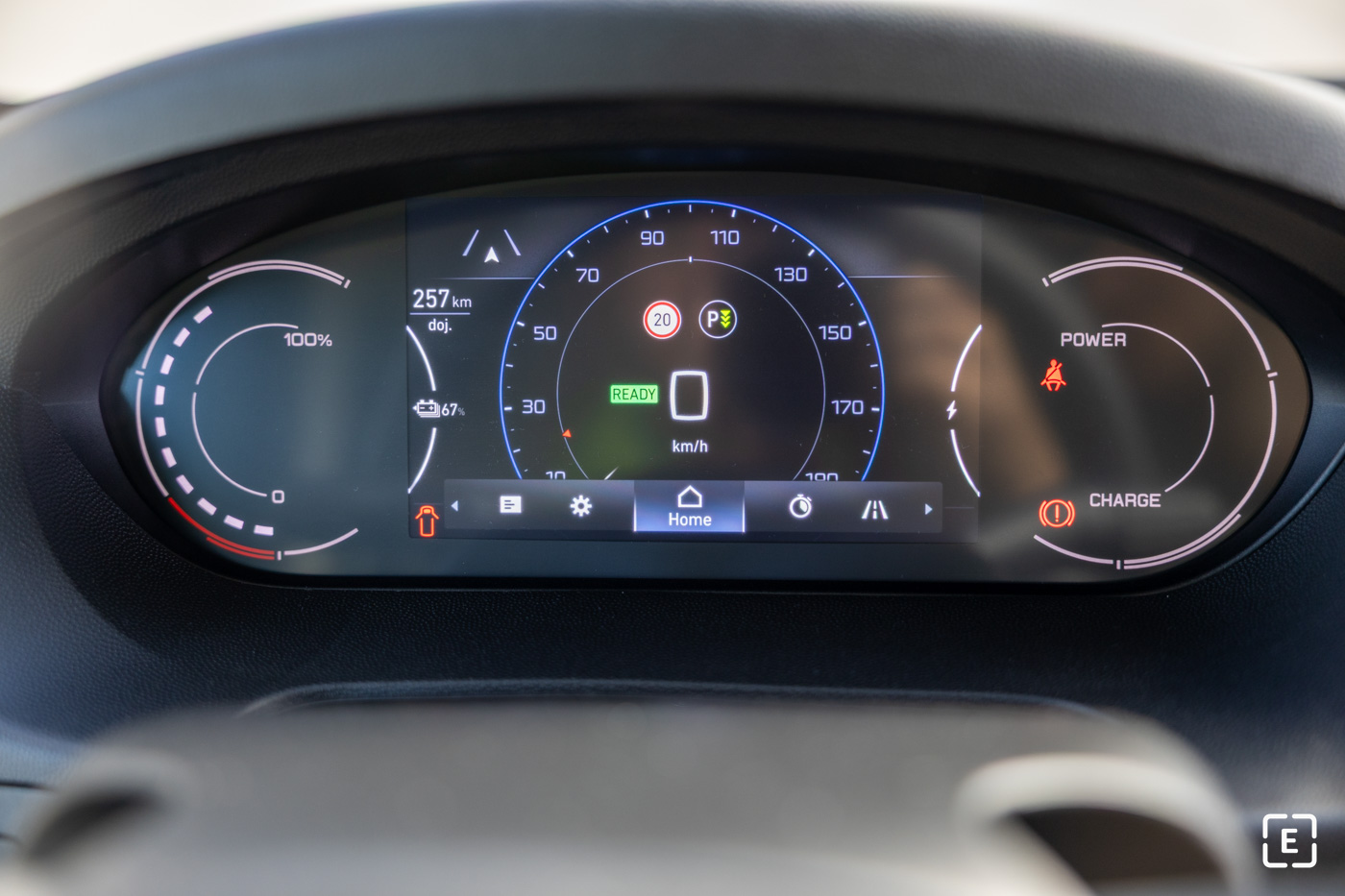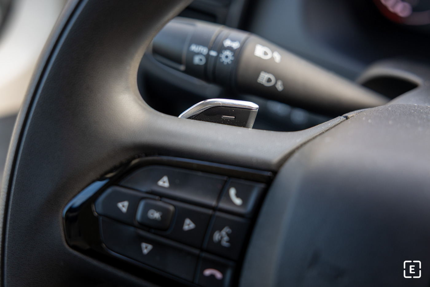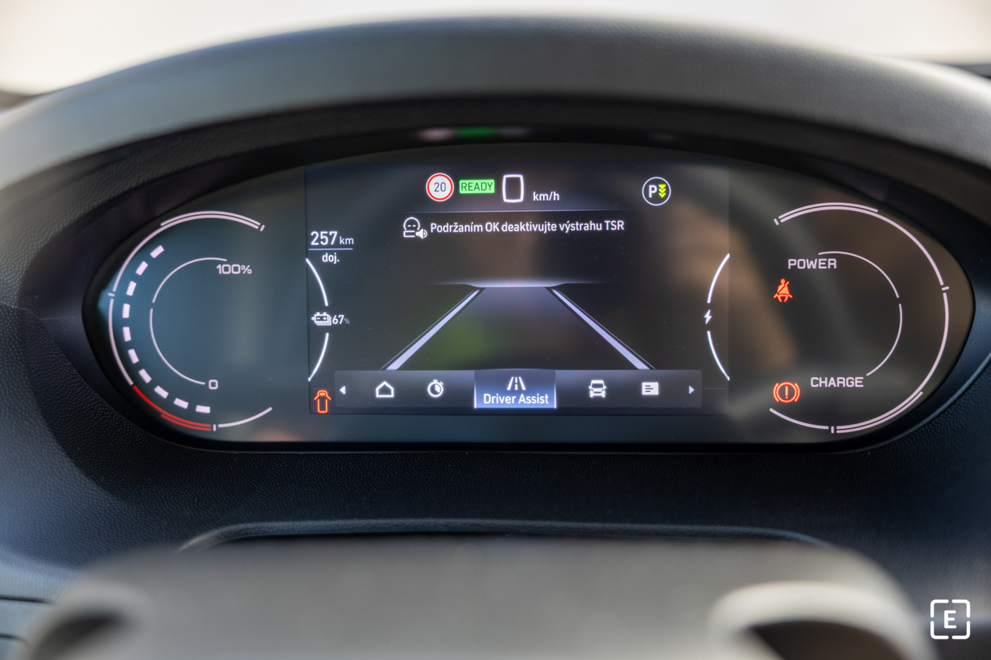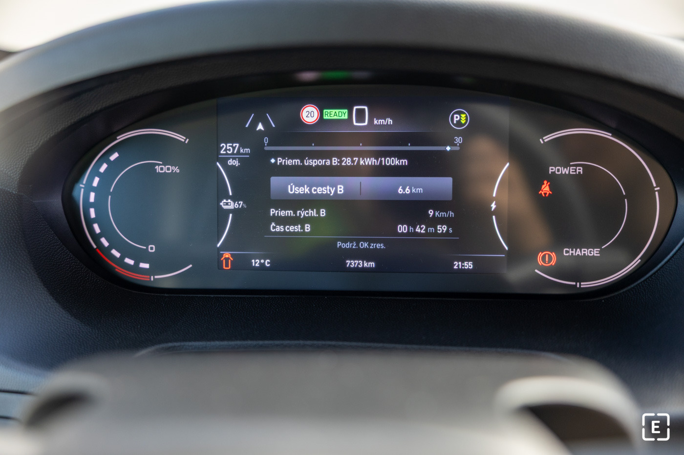 Začneme od ovládania, a najmä toho, čo súvisí s elektrickým pohonom. Rekuperácia sa ovláda najlepším možným spôsobom, teda pádlami pod volantom. Pri najvyššej úrovni však po pustení pedálu akcelerátora dosť trhá, najčastejšie sme jazdili s druhou najsilnejšou úrovňou, a do najsilnejšej prepínali len pri dobrzďovaní do križovatiek.