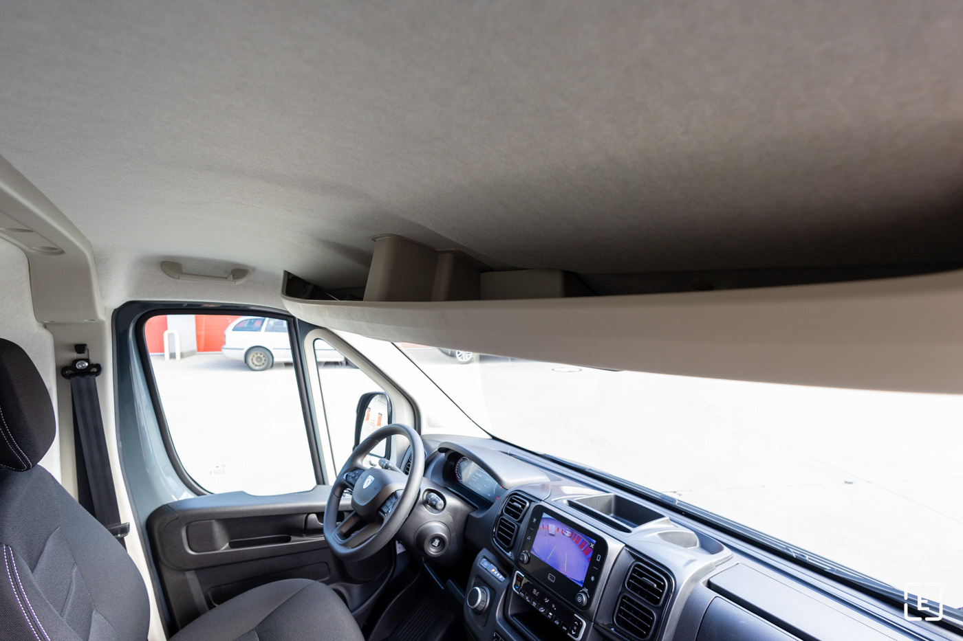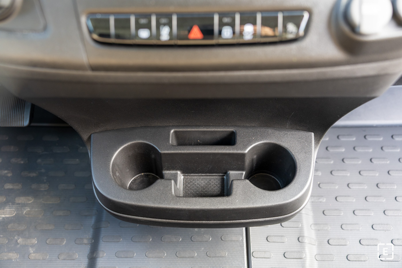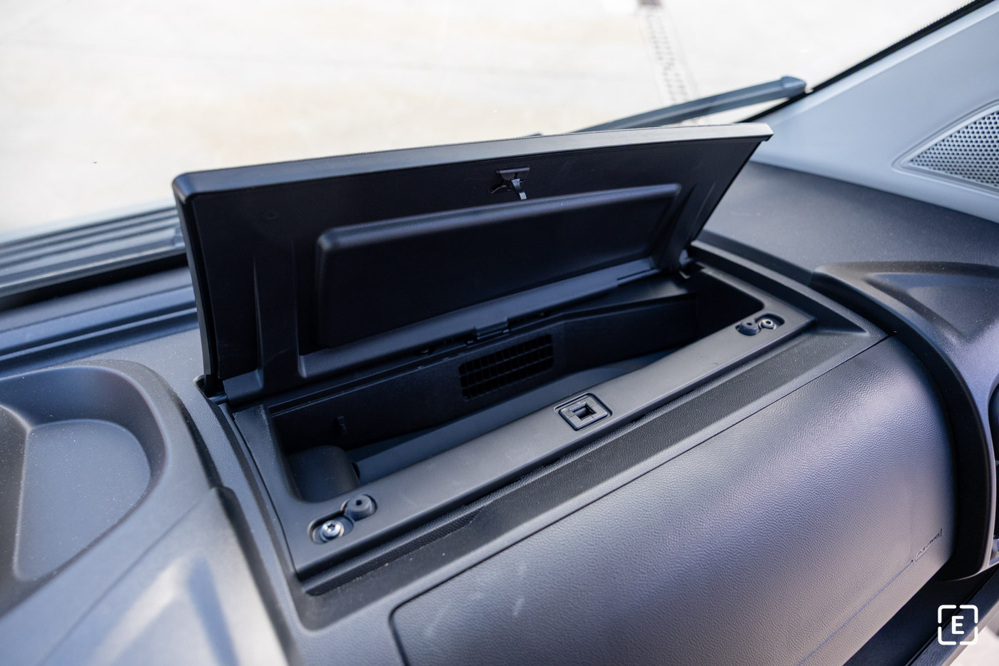 V interiéri nám potom celkom chýbal aj úložný box pre batožinu posádky. Pod dvojsedadlom spolujazdcov nájdeme len malú skrinku na povinnú výbavu, kvôli rámu sedadla tam ale cestovnú tašku či tašku na notebook neschováme – ak aj cestuje vodič sám, batožina mu bude cestovať po kabíne.