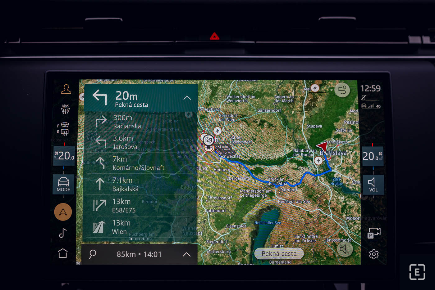 Nabíjanie sme sa rozhodli otestovať na 150 kW nabíjacej stanici OMV eMotion pod Bôrikom. Napriek mrazivým teplotám dosiahol pozoruhodné výsledky a prakticky okamžitý nábeh maximálneho výkonu, čo potvrdzuje, že batéria je značne predimenzovaná, resp. výkon je obmedzený s ohľadom na jej životnosť. Maximálny DC nabíjací výkon dosiahol počas nabíjania hodnotu 42,5 kW a nad 30 kW sa držal celý čas až do troch štvrtín nabitia, pri čom priemerný nabíjací výkon v spektre do 80 % SoC presiahol 33 kW.
