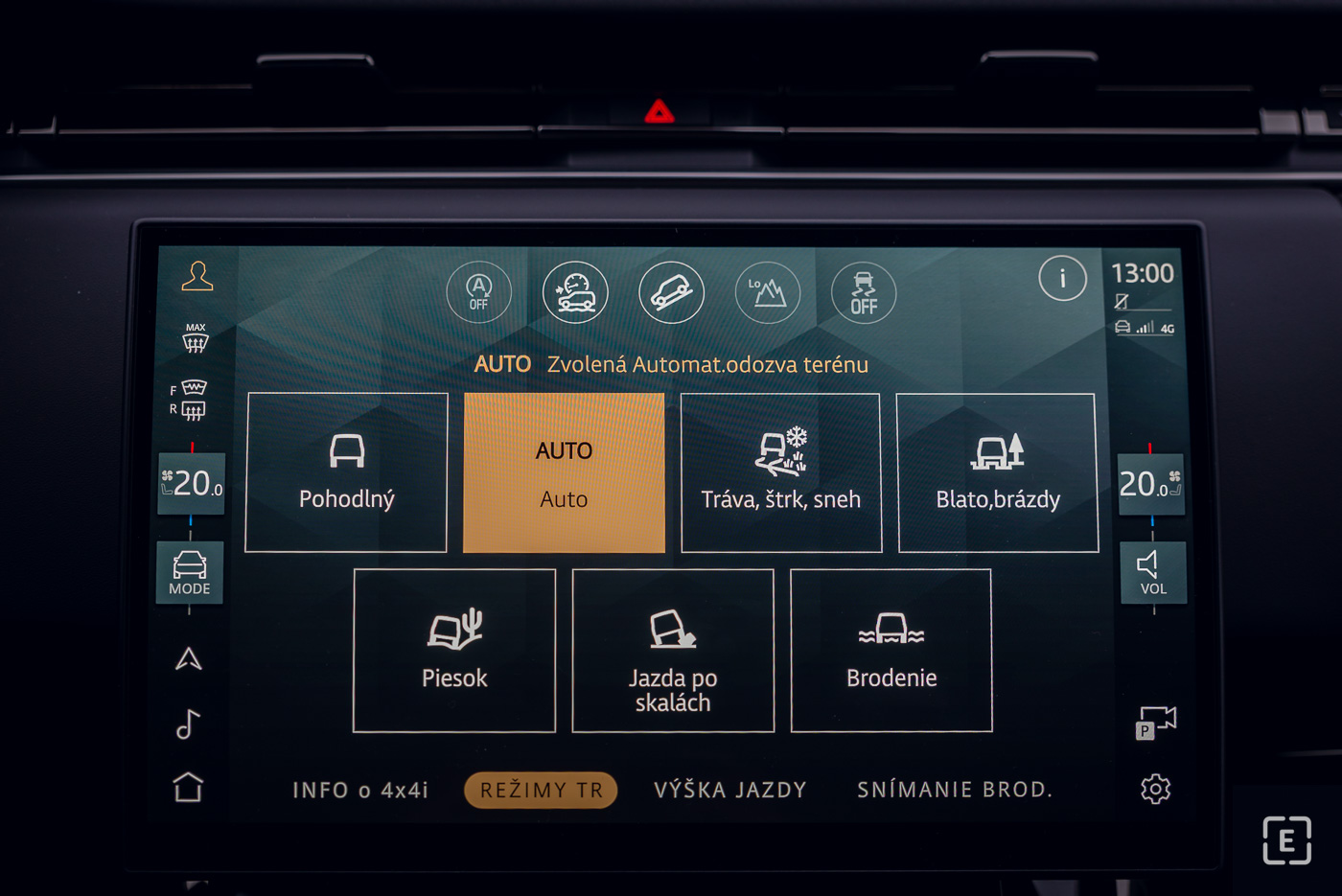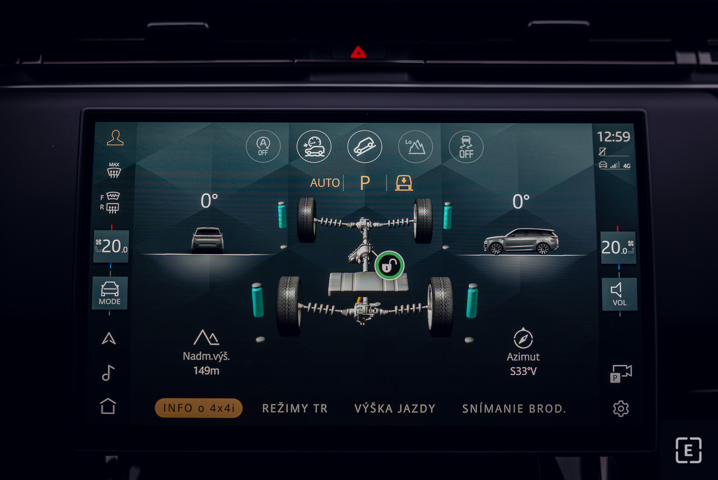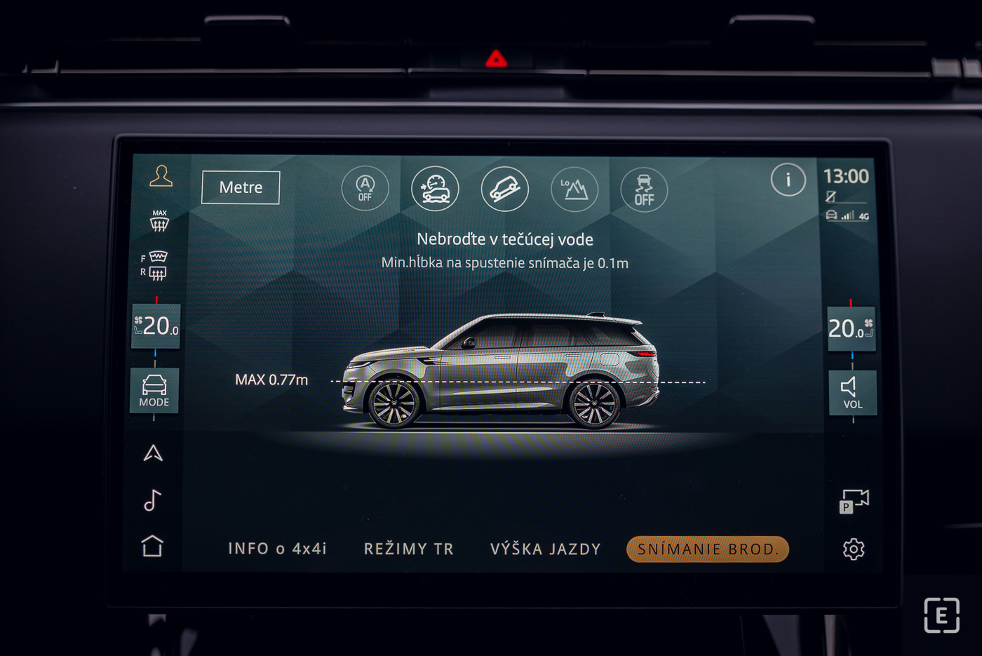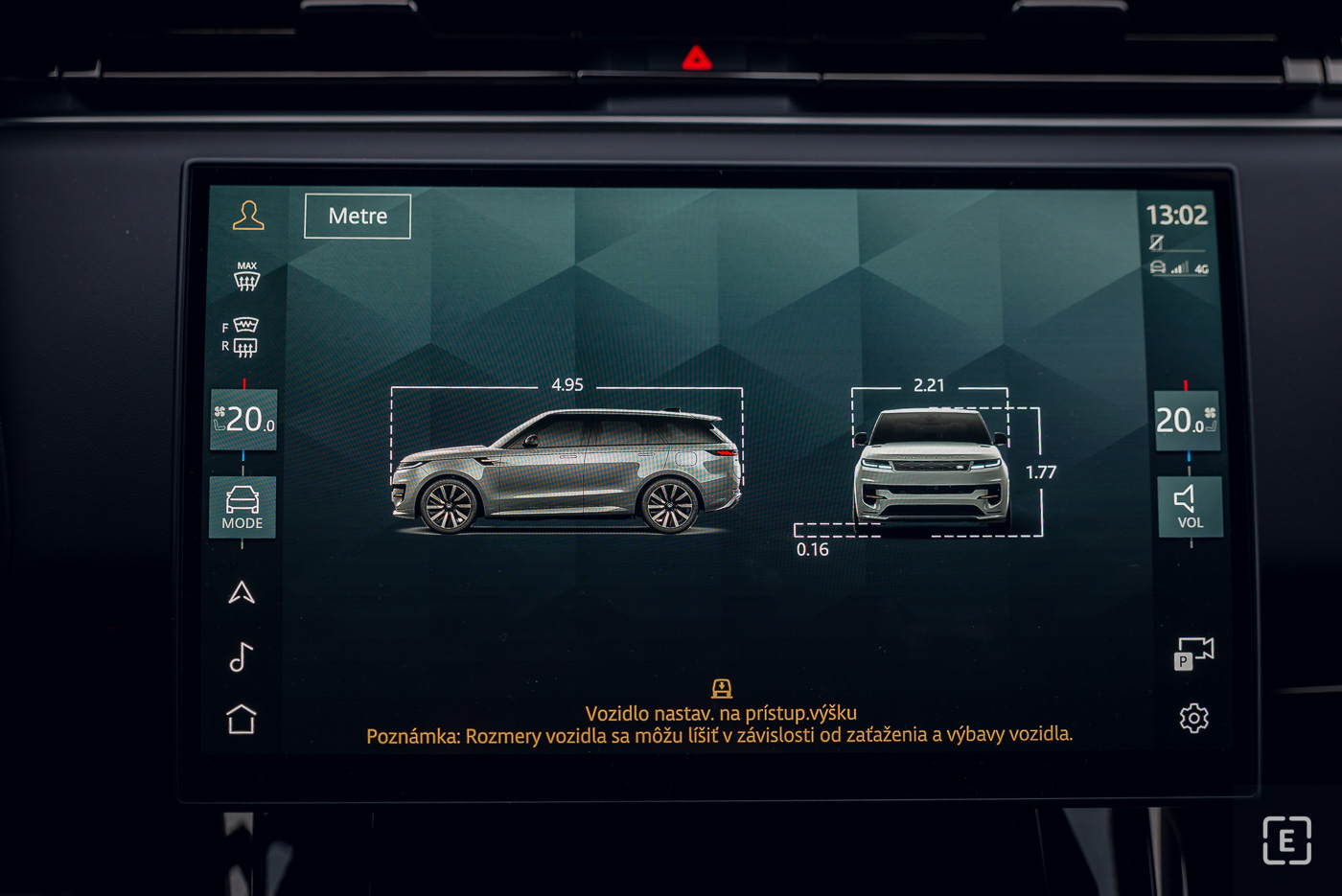 Vďaka tomu auto doslova „žehlí“ cestu a plavne prekonáva dlhé vlny na vozovke, čím posádke dopraje kráľovský komfort typický pre značku Range Rover. Vzduchový podvozok tiež umožňuje meniť svetlú výšku – od najnižšej nástupnej (Access) až po najvyššiu terénnu (Off-Road 2), kedy sa karoséria zdvihne až na 275 mm, čo zabezpečuje brodivosť až 900 mm.