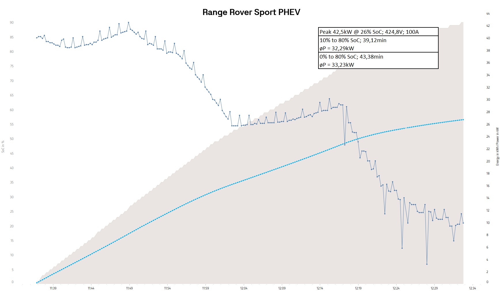 Toto je disciplína, kde deklasuje väčšinu konkurencie. Plug-in hybrid Range Rover Sport je vybavený batériou s celkovou kapacitou 38,2 kWh (z čoho využiteľných je 31,8 kWh). To je hodnota, ktorú aj dnes stále bežne dosahujú menšie elektromobily.