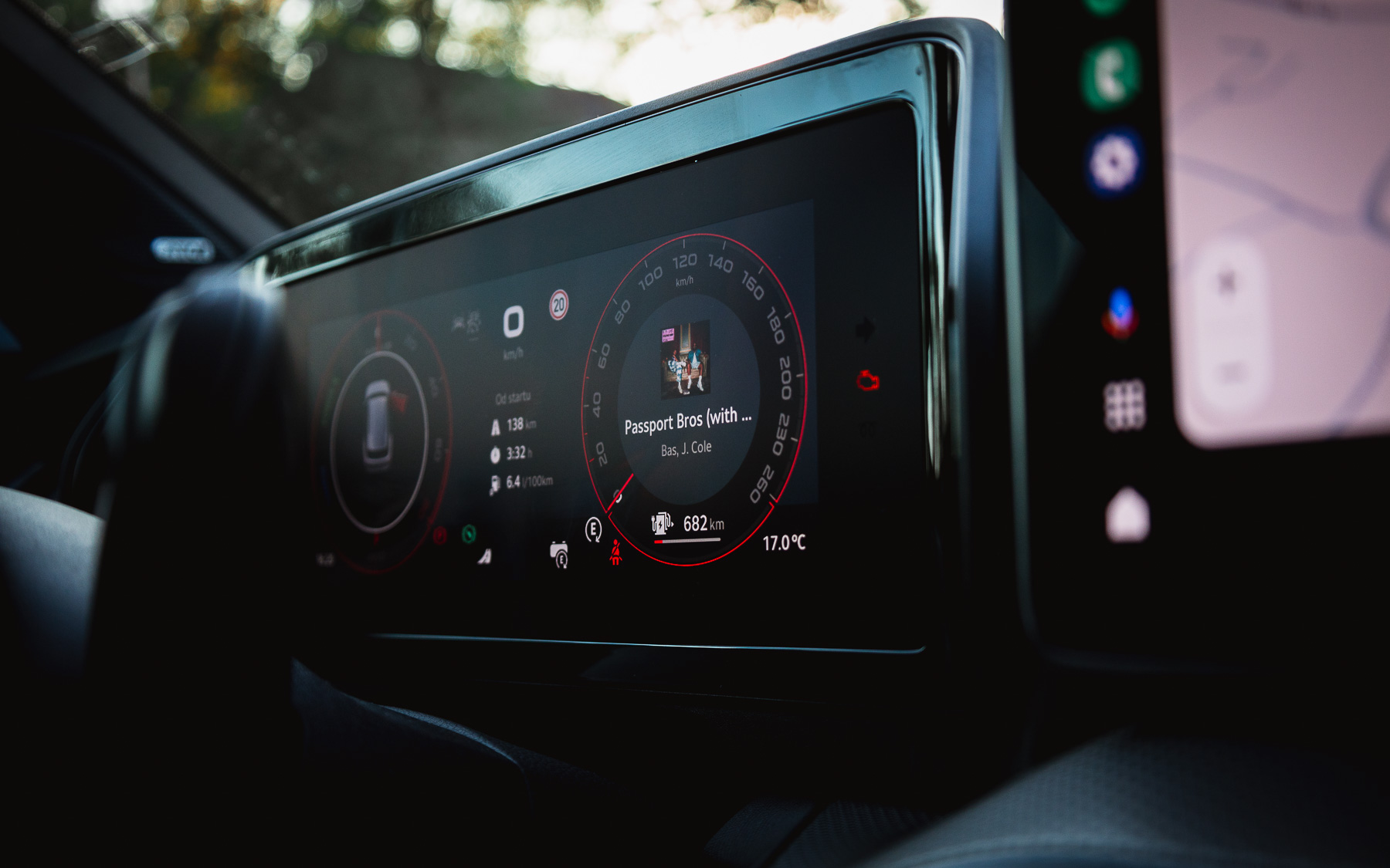 Na modernej palubnej doske sídli dotyková obrazovka infotainmentu. V základe má 10,4-palcovú uhlopriečku a považujem za dôležité pripomenúť, že v základe je bez navigácie. Tú získate za príplatok, rovnako ako 13-palcovú uhlopriečku obrazovky. Ovládanie infotainmentu je bezproblémové, reaguje rýchlo a všetko mi prišlo dostatočne prehľadné. Tu skutočne nemám čo vytknúť. Skvelým pomocníkom je z môjho pohľadu aj Head-Up displej, ktorý je súčasťou rovnakého paketu „Technology 13″ Plus“ (458 až 1 458 €) ako spomínaná väčšia obrazovka, webové rádio a navigácia.