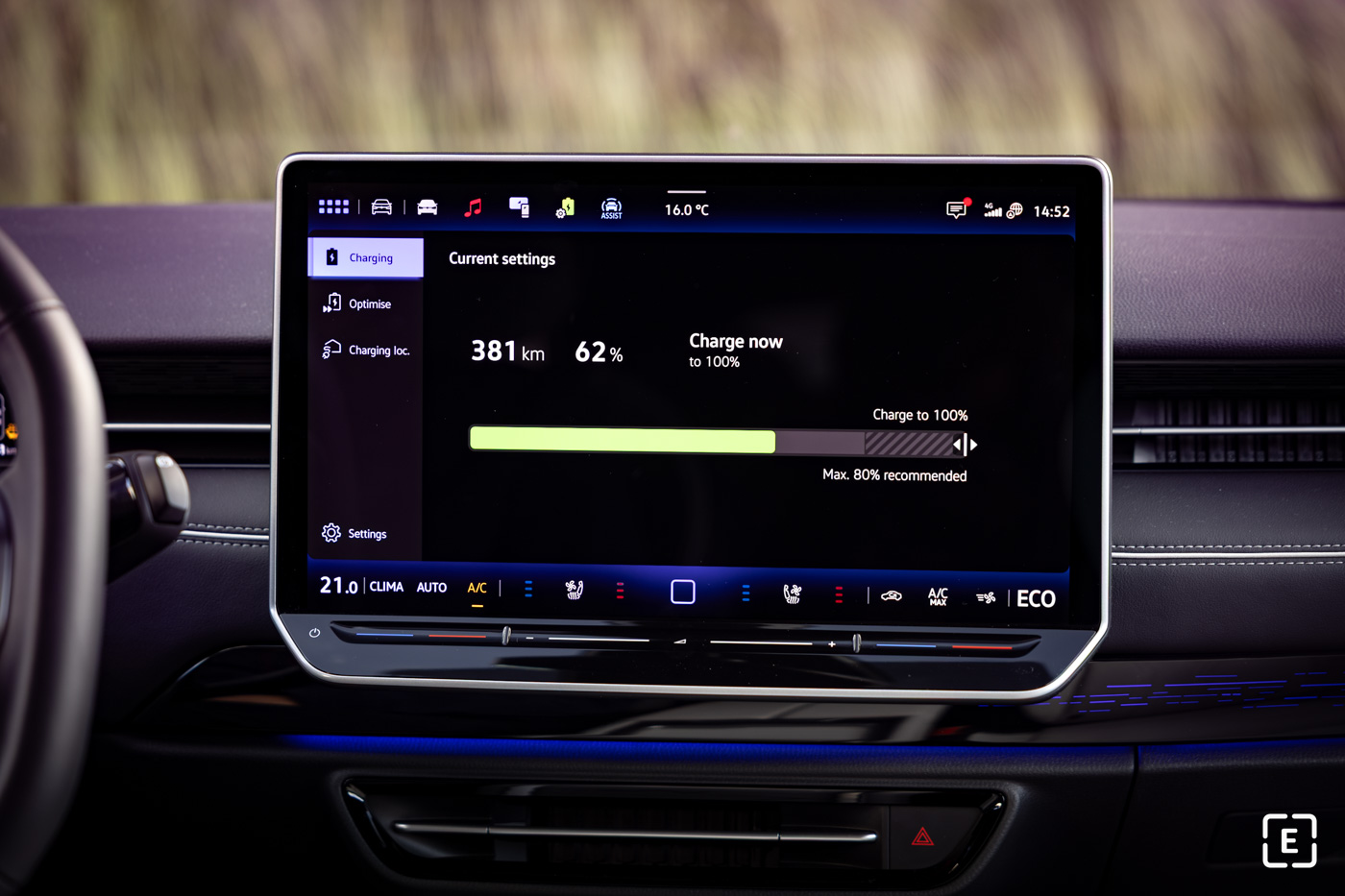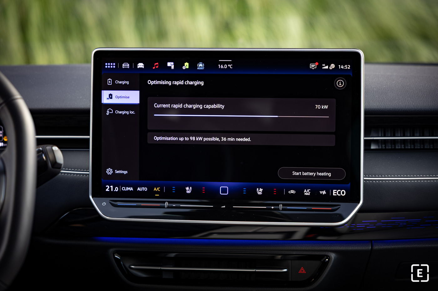 Predohrev akumulátora je k dispozícii buď automatický (po zadaní nabíjacej stanice ako cieľa do vstavanej navigácie), alebo manuálne aktiváciou virtuálneho tlačidla v infotainmente.