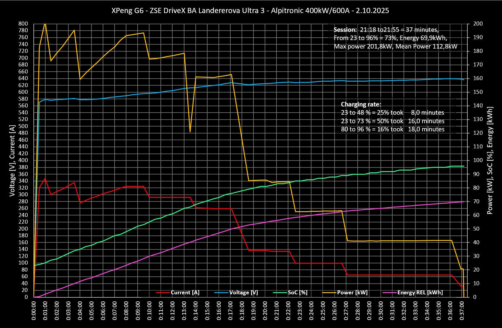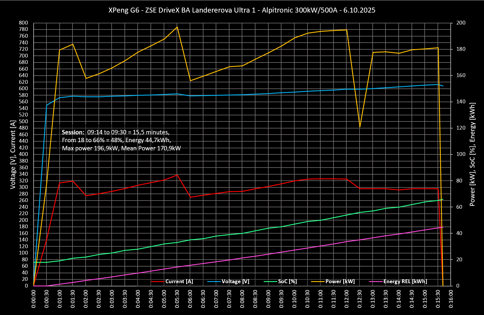 Na vysokej úrovni je tu aj nabíjanie, najmä teda čo sa týka jeho maximálneho výkonu. Výrobca uvádza za maximálny výkon až 280 kW, avšak nám sa počas testovania podarilo dostať len na 201 kW. Prinášame vám v tomto teste až dve nabíjacie krivky, pretože pri teste prvej sa vyplo nabíjanie už pri 23 %, a musel som nabíjanie spustiť znova. Potom už som úspešne donabíjal až do 96 %. Skúsil som si nabíjanie ešte raz, no ani v tomto prípade som nebol na 100 % úspešný, lebo po 15 minútach sa mi nabíjanie v 66 % opäť prerušilo.