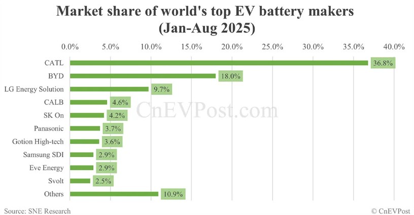 Čínski výrobcovia batérií CATL a BYD si naďalej udržiavajú vedúce pozície na globálnom trhu batérií pre elektromobily. V období od januára do augusta 2025 spoločne pokrývali už viac ako polovicu všetkých inštalovaných batérií v elektromobiloch po celom svete. Trh pritom medziročne narástol o takmer 35 % a dosiahol kapacitu 691,3 GWh, informuje CNEVpost.