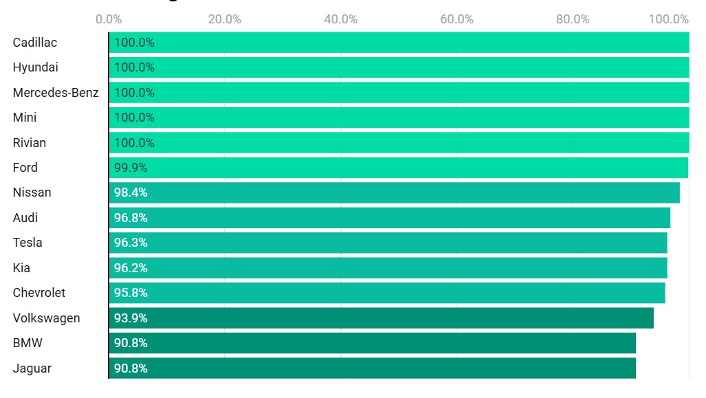 Spoločnosť Recurrent, ktorá analyzuje výkonnosť elektromobilov, nedávno hodnotila 14 značiek podľa toho, ako veľmi klesá ich dojazd po troch rokoch používania. Z ich výskumu vyšlo, že Cadillac, Hyundai a Mercedes-Benz patrili medzi najlepšie značky (v tomto smere), pričom aj Tesla si zachovala viac ako 96 % pôvodného dojazdu. Na druhej strane Volkswagen, BMW a Jaguar zaznamenali väčší pokles, no stále si udržali viac ako 90 %.