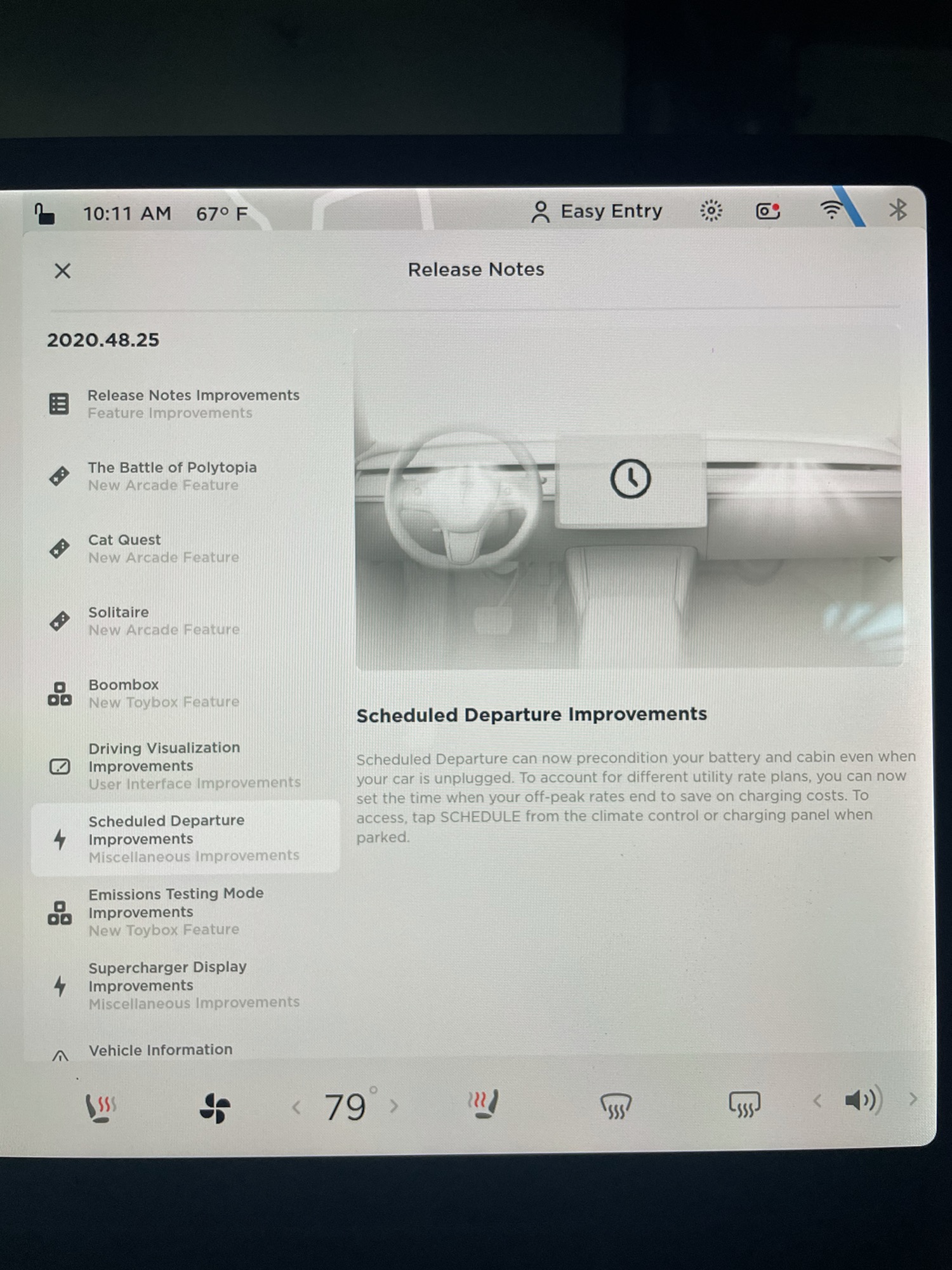 Softvérová aktualizácia Tesla zmenila aj funkciu predhriatia vozidla pred plánovaným odchodom (scheduled departure). Ponovom funguje aj v prípade, že auto nie je zapojené do elektrickej siete a nenabíja sa.