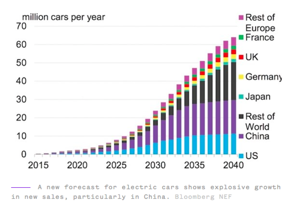 Agentúra Bloomberg zas odhadla budúce predaje elektromobilov po celom svete. Podľa nej sa má už v roku 2026 predávať 10 miliónov elektromobilov ročne a v roku 2040 až 65 miliónov.
